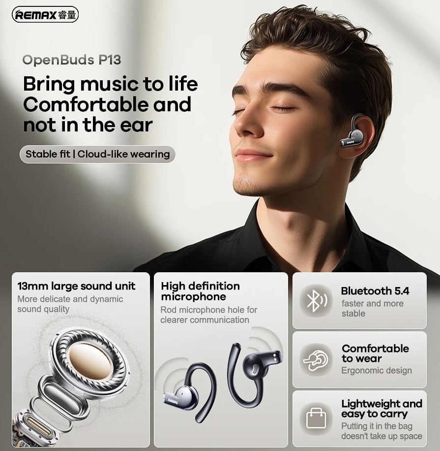 Ανακαλύψτε τα Remax OpenBuds, τα ασύρματα ακουστικά που συνδυάζουν προηγμένη τεχνολογία Bluetooth 5.4 με εργονομικό σχεδιασμό ανοιχτού τύπου για πραγματική ελευθερία κινήσεων και άνεση όλη μέρα.