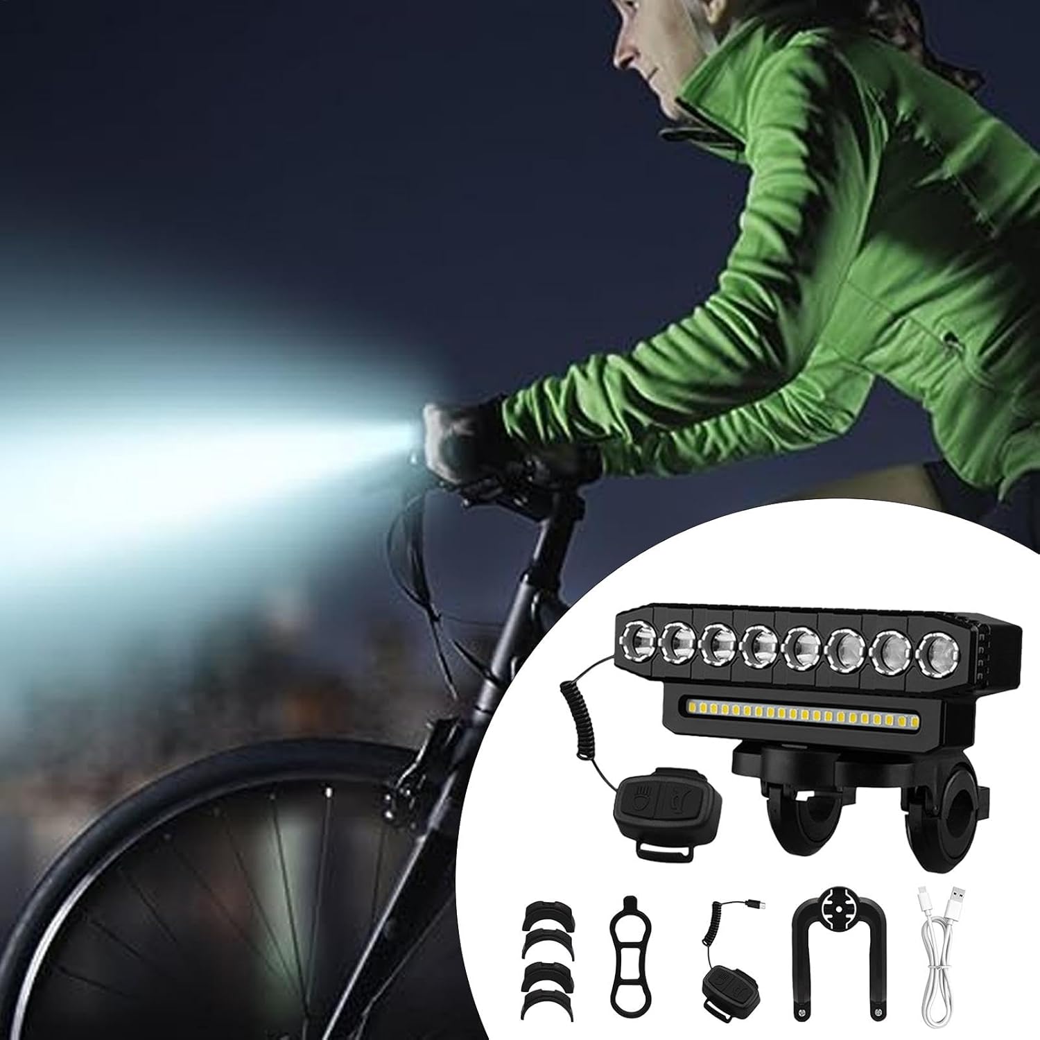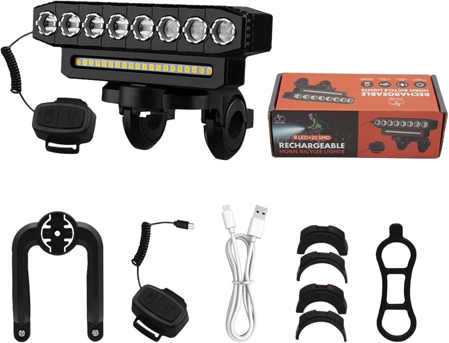 Εξοπλιστείτε για ασφαλείς και φωτεινές διαδρομές με το Rechargeable LED Cycle Front Light, ένα πανίσχυρο μπροστινό φως ποδηλάτου με 8 LED, πλευρική μπάρα 20 SMD και ενσωματωμένη κόρνα 130 dB για μέγιστη ορατότητα και ασφάλεια.