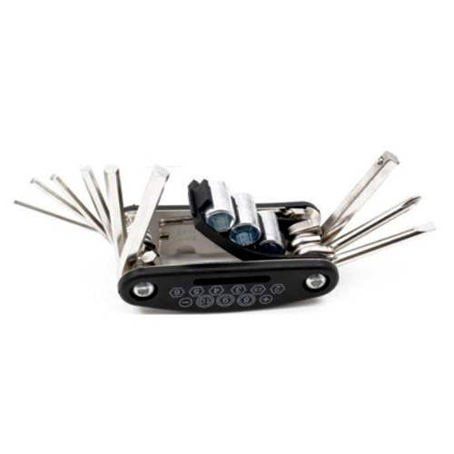 Ένα ελαφρύ κομψό και εξελιγμένο πολυεργαλείο που ικανοποιεί όλες τις ανάγκες του ποδηλάτη και τις σχέσεις του με τις βίδες του ποδηλάτου. Σε ανθεκτική αλουμινένια θήκη με διπλή βίδα που κρατάει μαζί όλο το μηχανισμό όταν το χρησιμοποιείτε. Το εργαλείο περιέχει 1 κατσαβίδι με ίσια μύτη, 1 σταυροκατσάβιδο, 3 καρυδάκια και 6 κλειδιά allen.