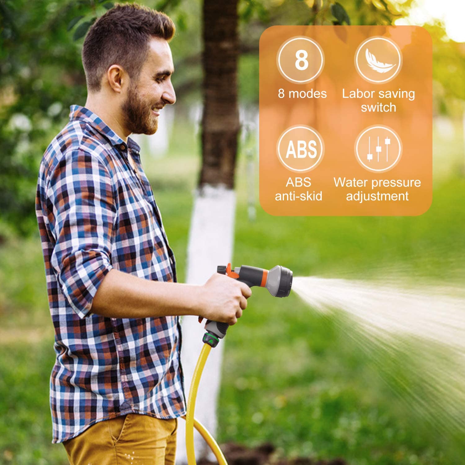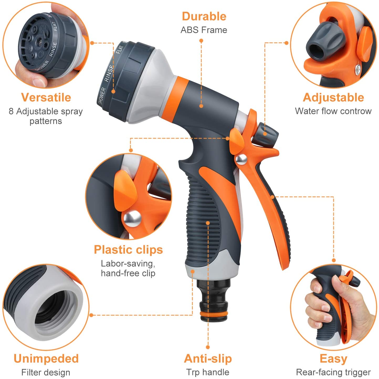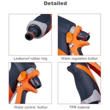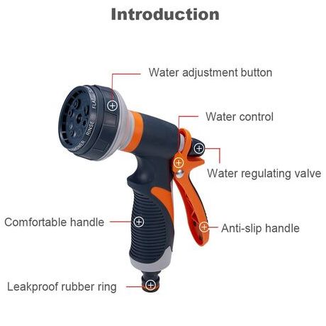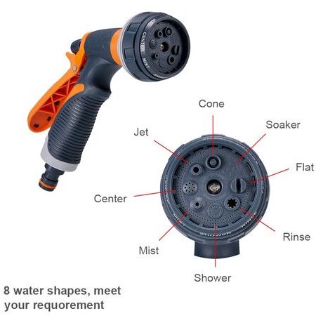 Πιστόλι Νερού Πολλαπλών Επιλογών. Με επιλογή 8 διαφορετικών τύπων εκτόξευσης: λεπτή ομίχλη, πίδακα πίεσης, επίπεδο πίδακα, βεντάλια, βροχή, κώνος, καταράκτης, βρύση.