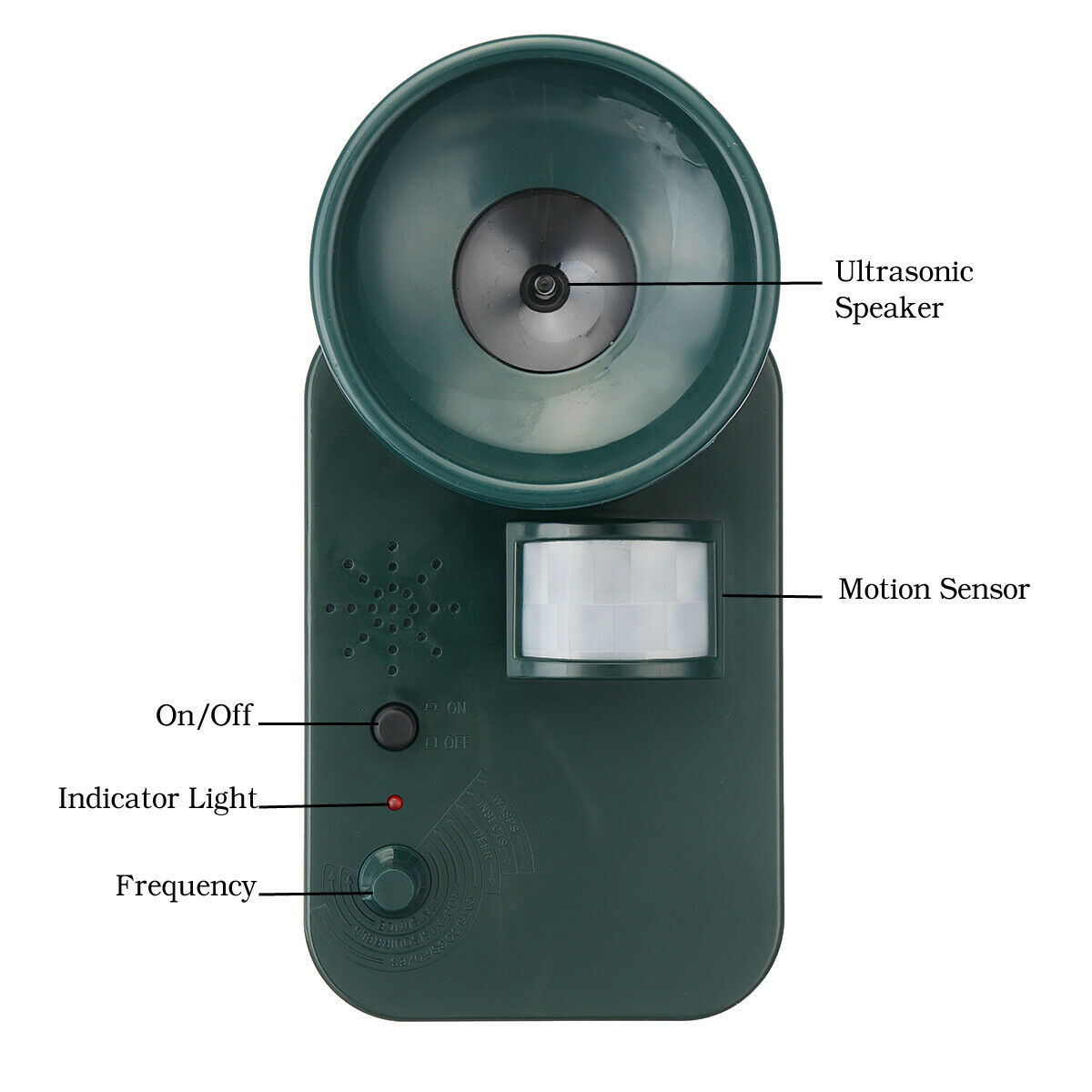 Απωθεί με δυνατούς υπέρηχους που εκπέμπει ένα ευρύ φάσμα των ζώων όπως γάτες, τα σκυλιά, αλεπούδες, σκίουροι, αρουραίους, ποντίκια κλπ. Ο υπέρηχος που εκπέμπει είναι ενοχλητικός για τα ζώα και απομακρύνονται απο την συσκευή άρα και απο την περιοχή κάλυψης.