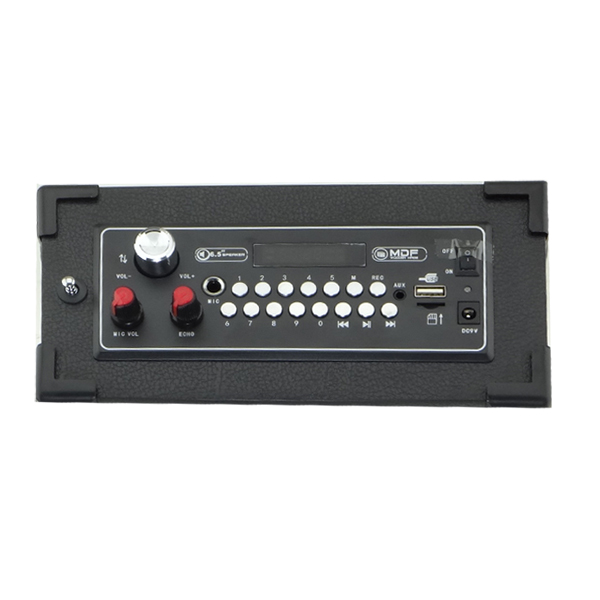 Δυνατό ηχείο με ενσωματωμένο ενισχυτή 100Watt PMPO, woofer 5,2’’, USB/SD Player, FM Radio και δυναμικό μικρόφωνο.
