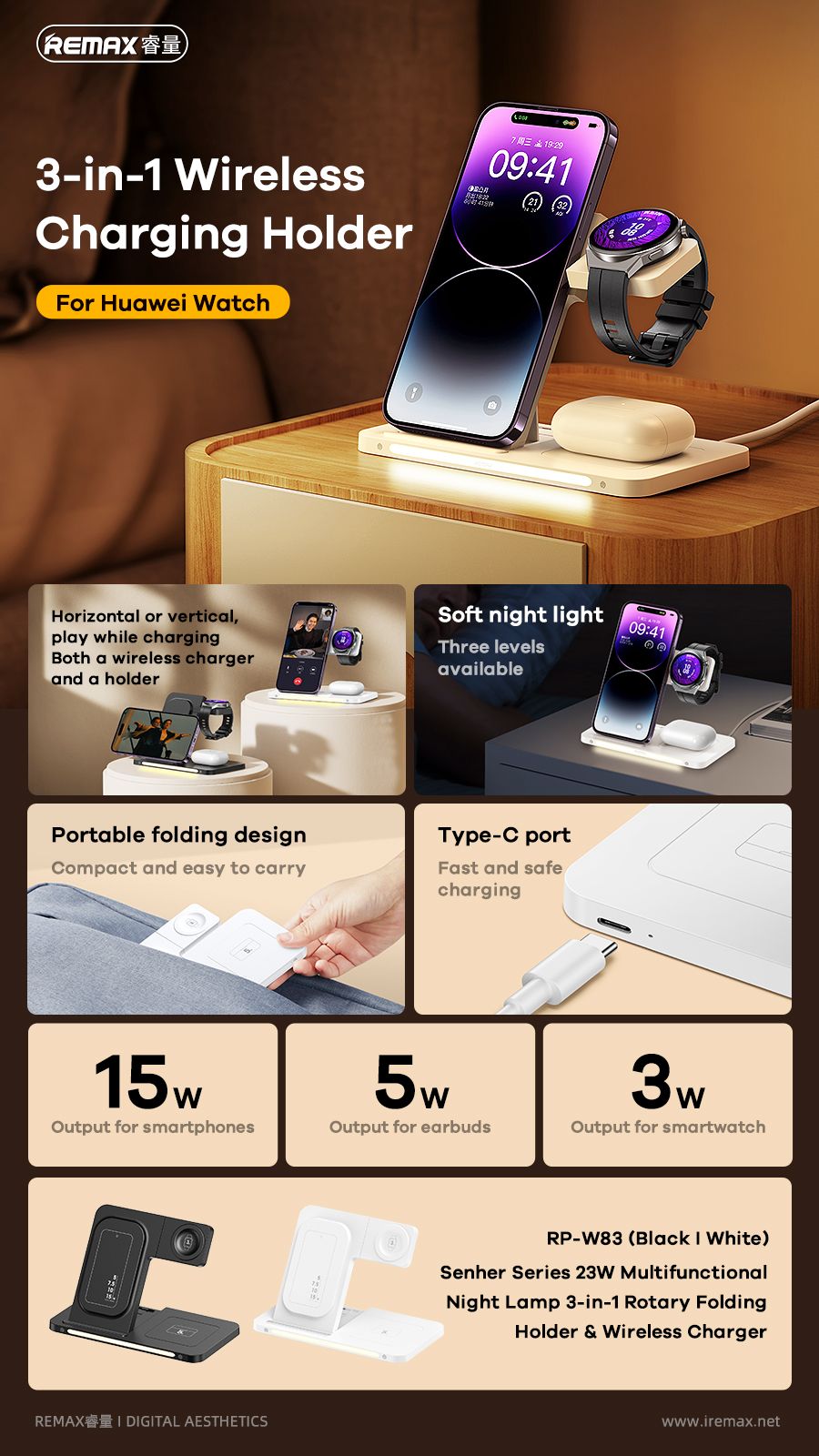 Περιστροφική αναδιπλούμενη βάση & ασύρματος φορτιστής με Λαμπτήρα νύχτας 3 σε 1 Remax RP-W83 Λευκό ένα gadget με πολλές λειτουργίες!