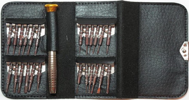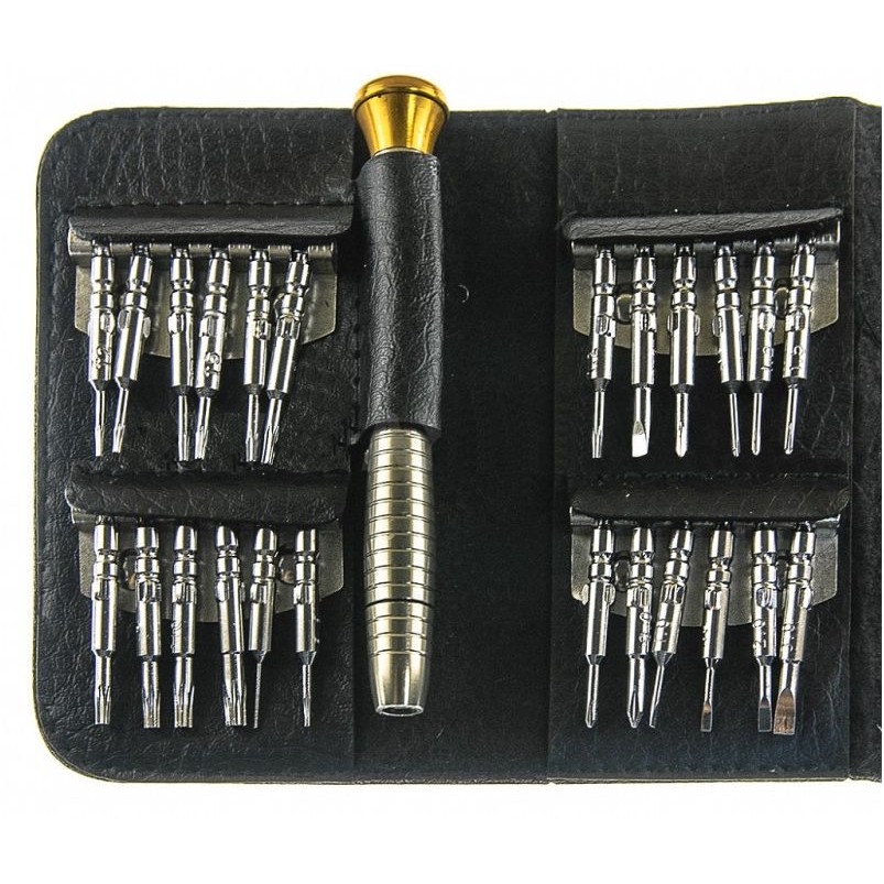 Κατάλληλο για επισκευές σε κινητά, ρολόγια, γυαλιά, κτλ. Το σετ αποτελείται από μία λαβή και 24 διαφορετικά κατσαβίδια μικρής διάστασης. Οι κεφαλές είναι μαγνητικές.