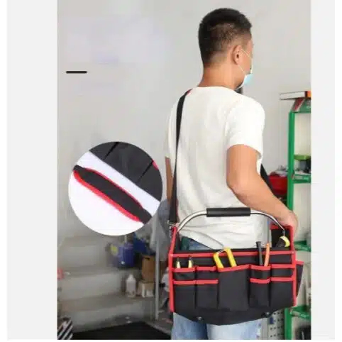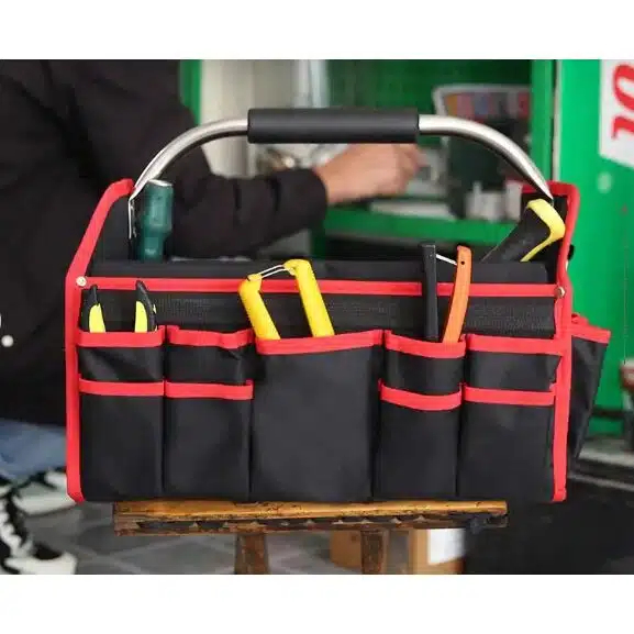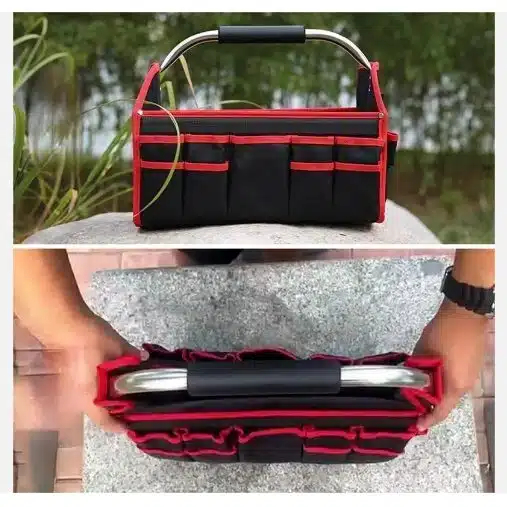 Τσάντα εργαλείων ανοιχτού τύπου σε μαύρο χρώμα, κατασκευασμένη από ανθεκτικό πολυεστέρα και σχεδιασμένη για την αποθήκευση και τη μεταφορά εργαλείων.