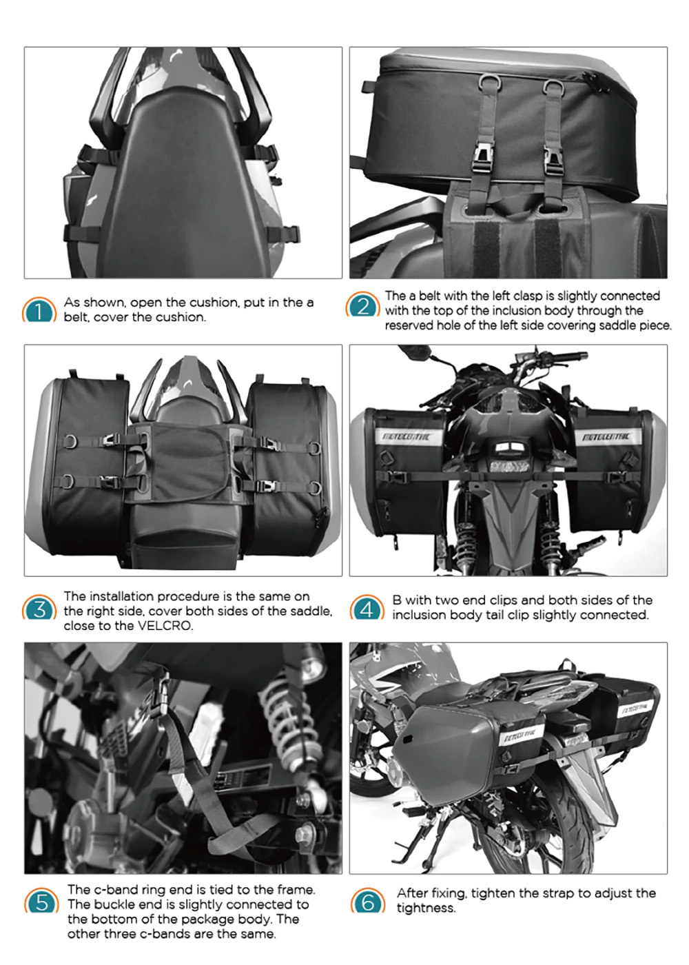 Διαθέτουν ειδικό ρυθμιζόμενου μήκους σχεδιασμό με velcro (σκρατς), για να "αγκαλιάζουν" το πάνω μέρος της σέλας - καθίσματος ή της ουράς της μοτοσυκλέτας σας. Χάρη σε αυτό τον σχεδιασμό, μπορούν να τοποθετούνται εύκολα, γρήγορα και με ασφάλεια. Διαθέτουν και ιμάντες πρόσδεσης ασφαλείας.