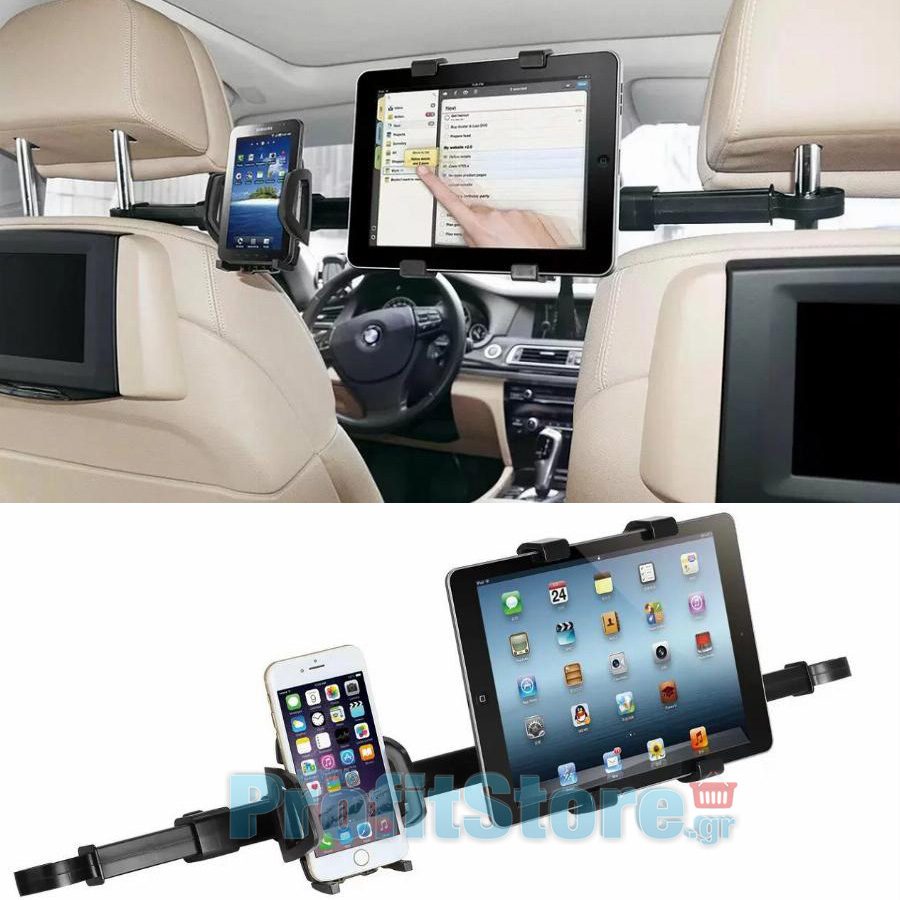 Η Βάση στήριξης 2 σε 1 στο προσκέφαλο του αυτοκινήτου μπορεί να δεχτεί συσκευές με μέγεθος από 4 έως 10cm και 12.5 έως 18cm ενώ ο έξυπνος σχεδιασμός της επιτρέπει την περιστροφή της συσκευής για την καλύτερη δυνατή θέαση! Προσαρμόζεται σε όλα τα αυτοκίνητα χωρίς δύσκολη εγκατάσταση και εργαλεία, ενώ την τοποθετείτε απλώς ανάμεσα στα 2 προσκέφαλα των μπροστινών καθισμάτων.