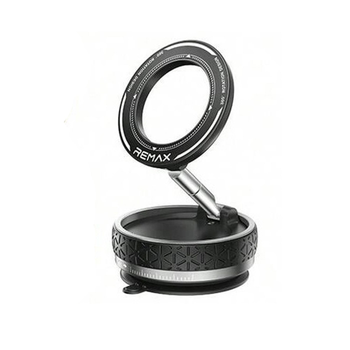 Μαγνητική βάση κινητού Remax σε μαύρο χρώμα με ισχυρή βεντούζα, περιστροφή 360° και ρύθμιση 3 αξόνων. Σταθερή, κομψή και ιδανική για αυτοκίνητο, γραφείο ή σπίτι.