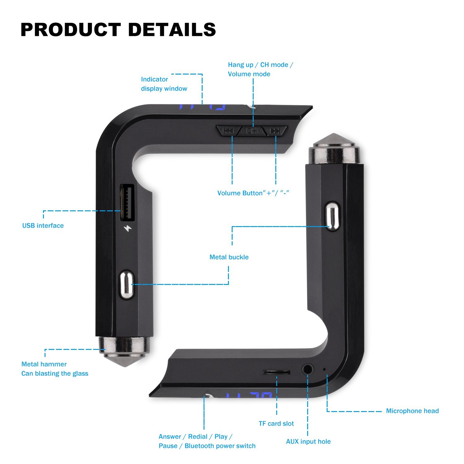 Το απόλυτο gadget για το αυτοκίνητο σας! Συνδυάζει σφυράκι - ακίδα θραύσης κρυστάλλων (τζαμιών), bluetooth ανοικτής ακρόασης για το κινητό σας, USB/TF Card MP3 player, AUX input Jack 3,5mm και φορτιστή USB υψηλής ισχύος 2Α.