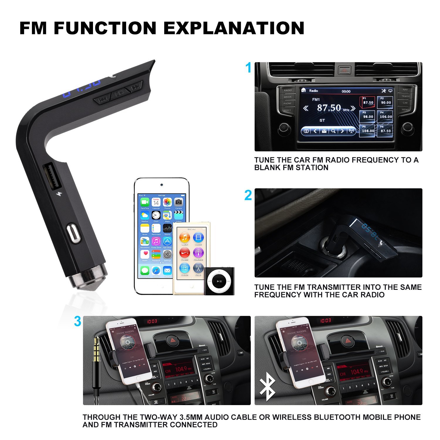 Το τοποθετείτε απλά στον αναπτήρα του αυτοκινήτου σας και στη συνέχεια αναζητάτε τη συχνότητα FM που εκπέμπει στο ραδιόφωνο του αυτοκινήτου σας. Τόσο απλά και τόσο εύκολα!