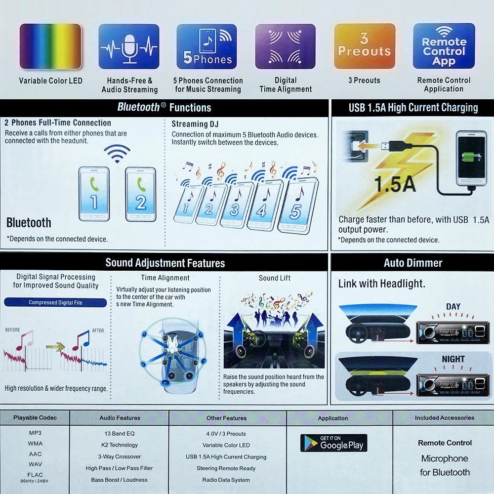 Διαθέτει λειτουργία ασύρματης σύνδεσης με το κινητό σας μέσω Bluetooth για να μπορείτε να μιλάτε hands - free στο τηλέφωνο σε ανοιχτή ακρόαση μέσω τα ηχεία του αυτοκινήτου αλλά και να ακούτε την αγαπημένη σας μουσική μέσω Spotify, Apple Music, Youtube κα