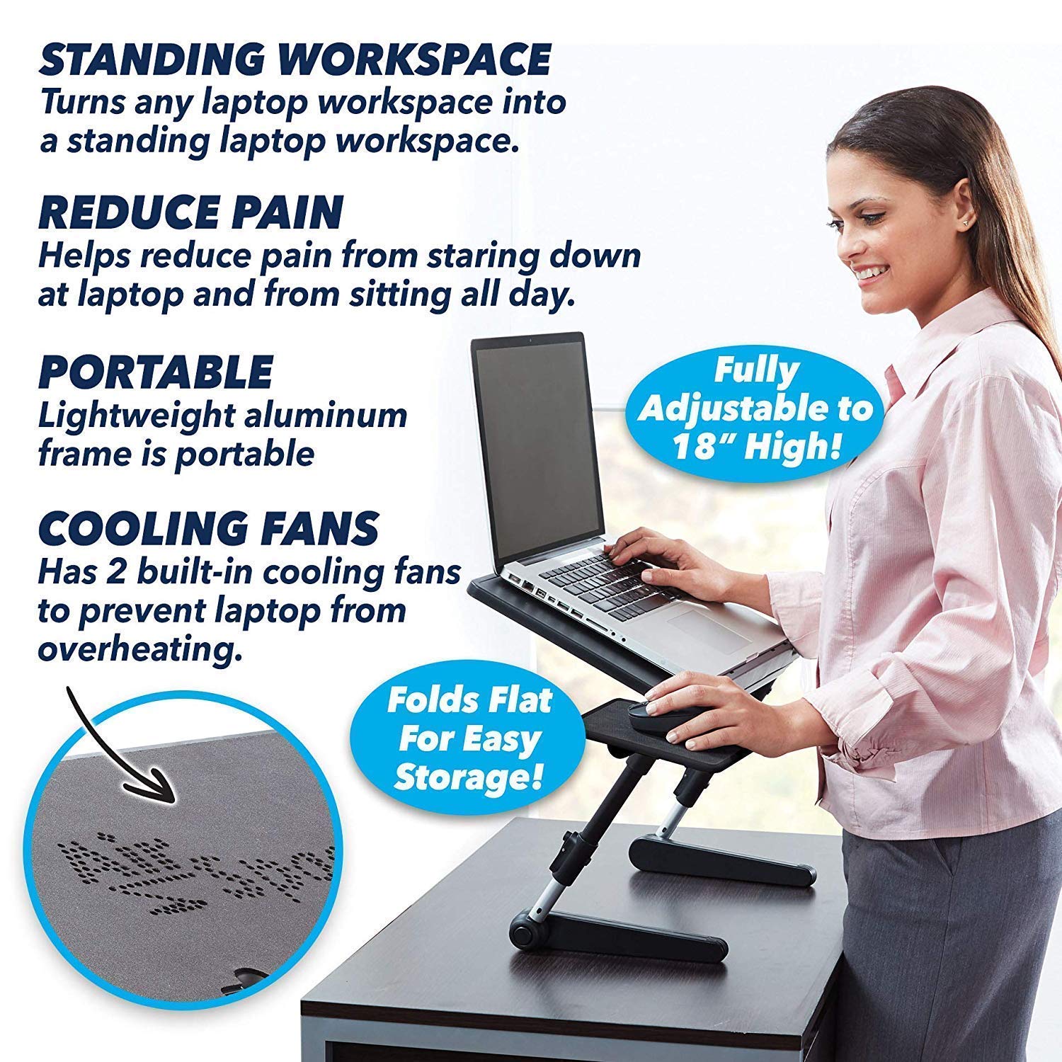 Η βάση φορητού υπολογιστή προσαρμόζεται σε ύψος 55εκ. και στρέφεται κατά 180 μοίρες, ώστε να μπορείτε να εργαστείτε στην τέλεια θέση – μετατρέψτε την σε μόνιμη επιφάνεια εργασίας και τοποθετήστε την οθόνη σας όπου σας βολεύει καλύτερα.