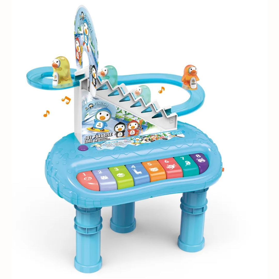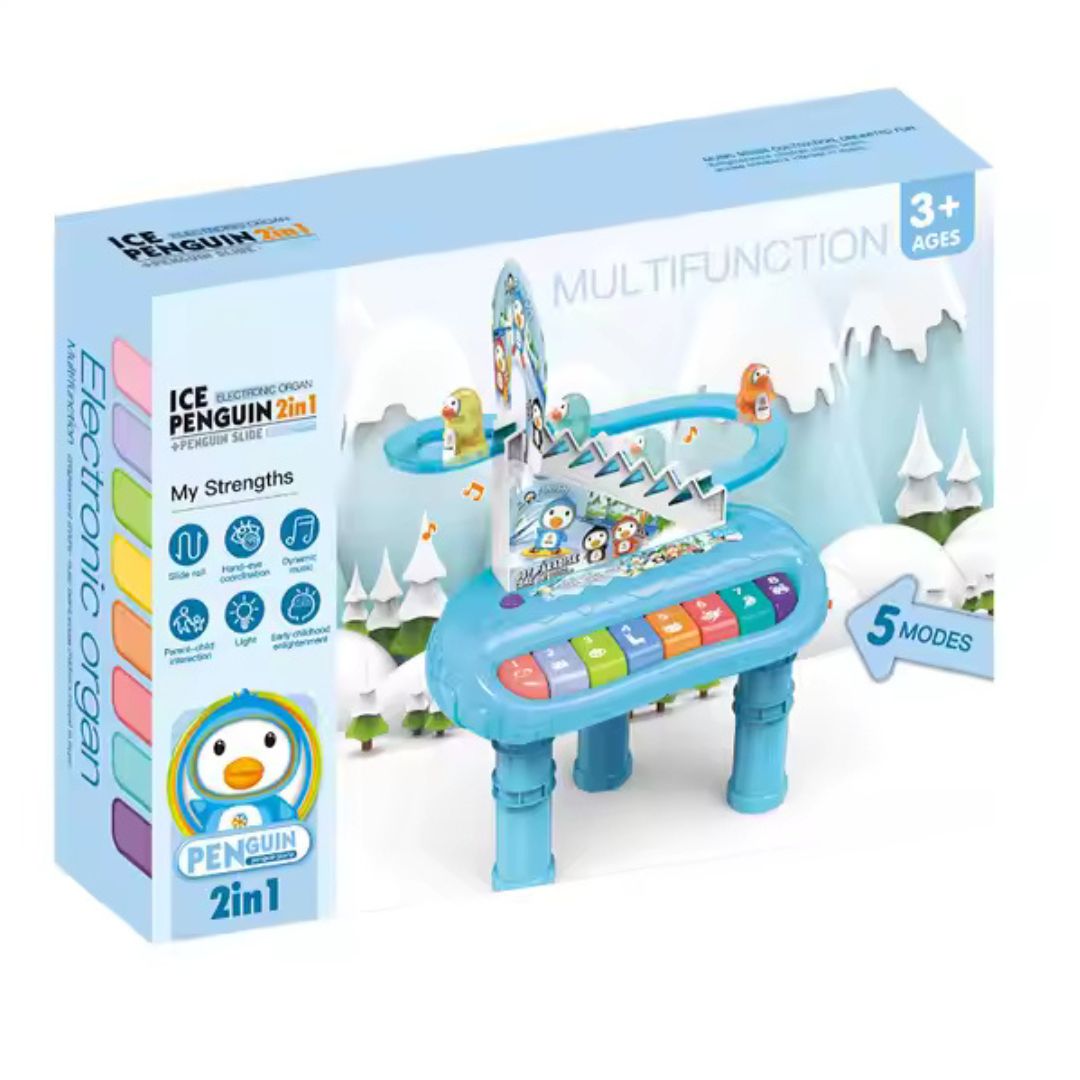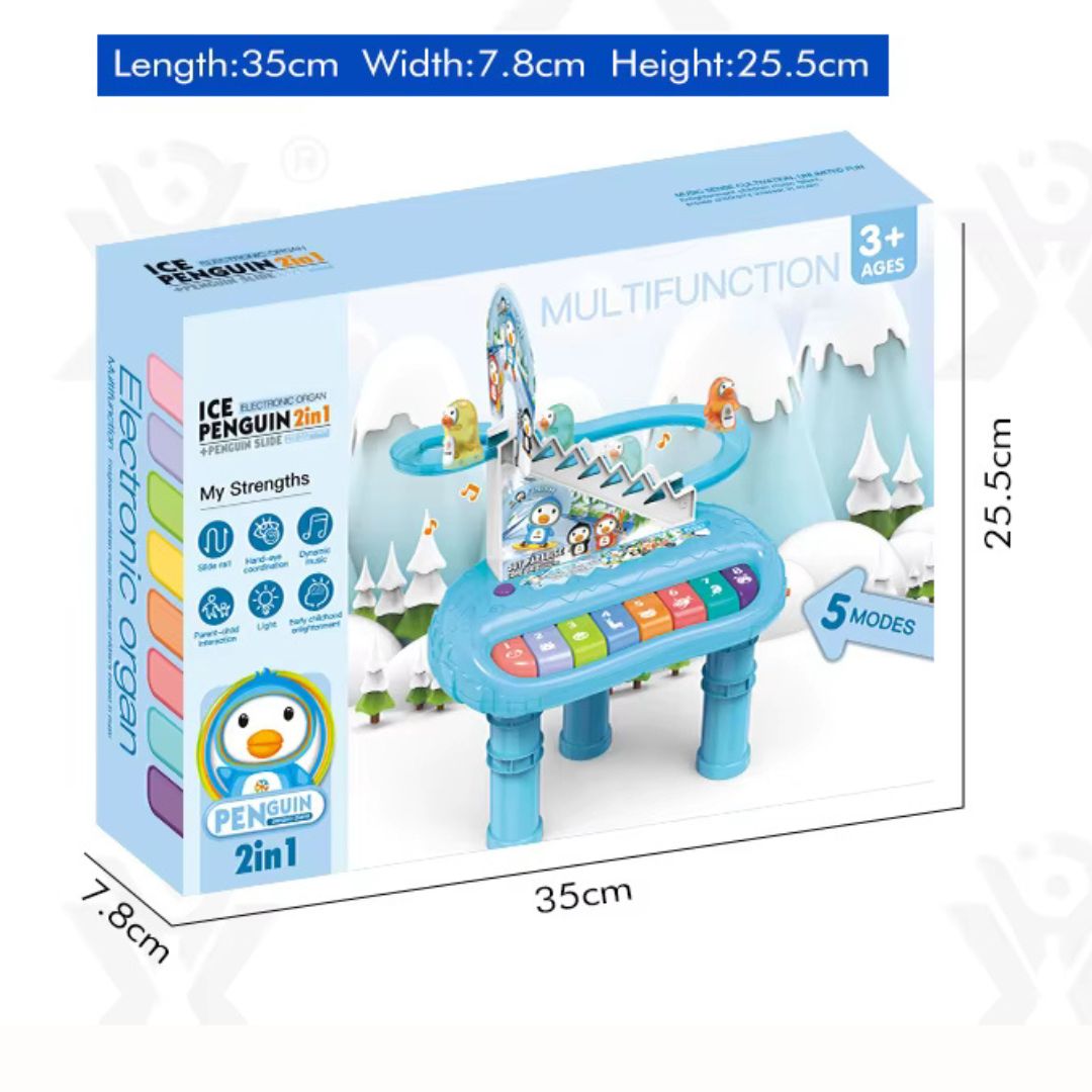 Οι μικροί παίκτες μπορούν να πατήσουν τα πολύχρωμα πλήκτρα του ηλεκτρονικού πιάνου για να ανακαλύψουν ήχους και μελωδίες, ενώ παράλληλα απολαμβάνουν τη χαρά του παιχνιδιού με τη διαδραστική τσουλήθρα των πιγκουίνων.