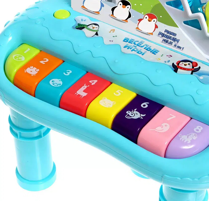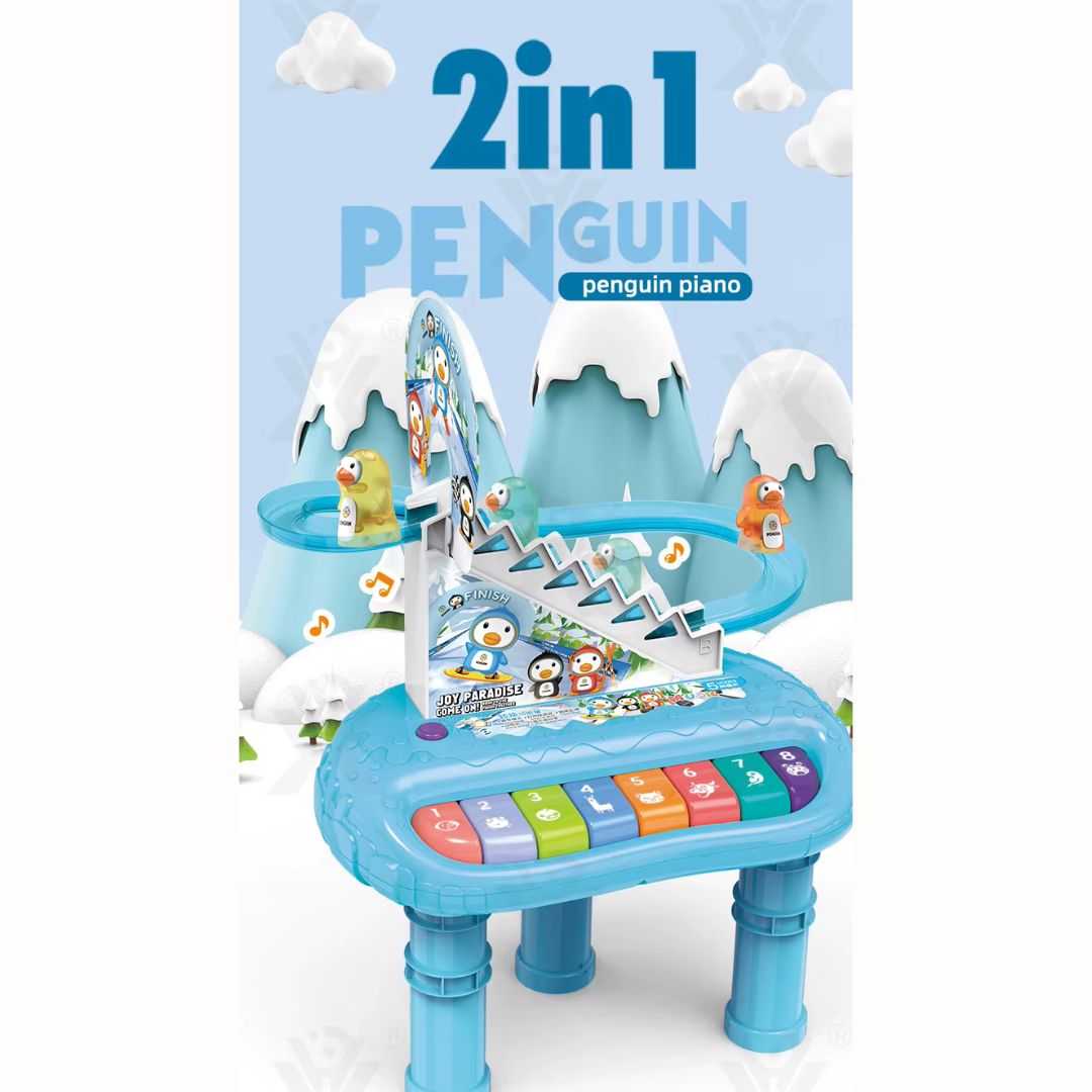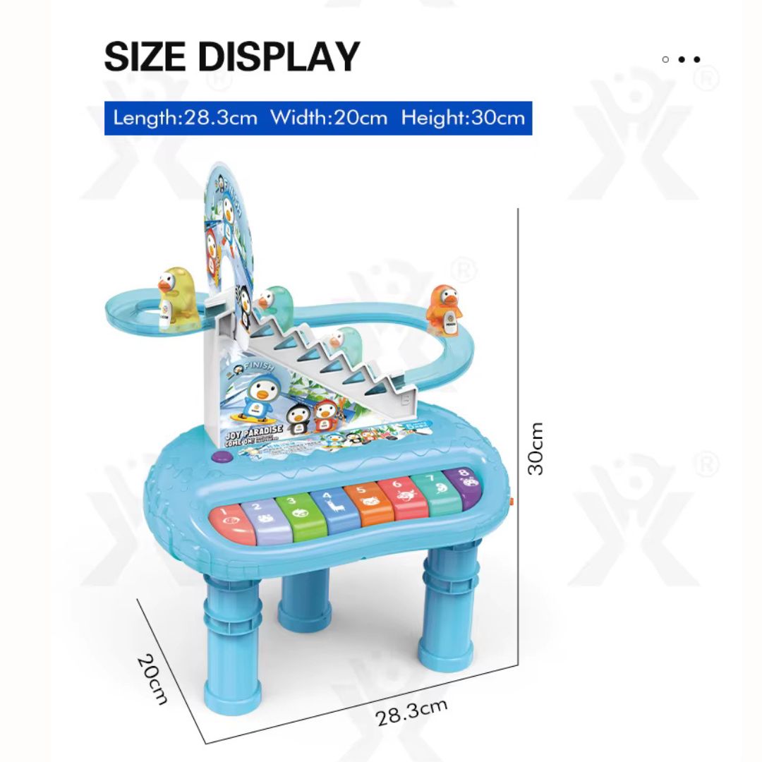 Οι μικροί παίκτες μπορούν να πατήσουν τα πολύχρωμα πλήκτρα του ηλεκτρονικού πιάνου για να ανακαλύψουν ήχους και μελωδίες, ενώ παράλληλα απολαμβάνουν τη χαρά του παιχνιδιού με τη διαδραστική τσουλήθρα των πιγκουίνων.