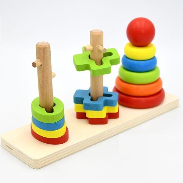 Ξύλινη πλατφόρμα με πυργάκια σε διαφορετικά σχήματα και χρώματα.