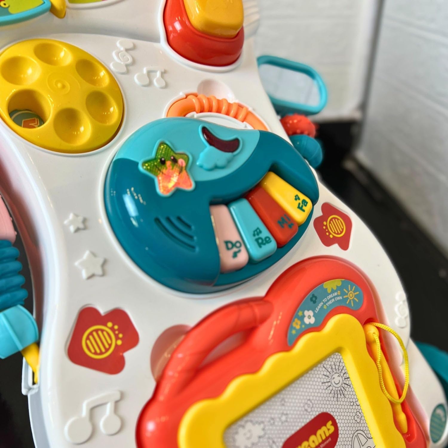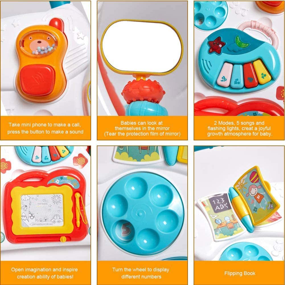 ✔️Δραστηριότητες αφής όπως περιστρεφόμενα γρανάζια και διαδραστικά κουμπιά, που αναπτύσσουν την αλληλεπίδραση με το περιβάλλον.