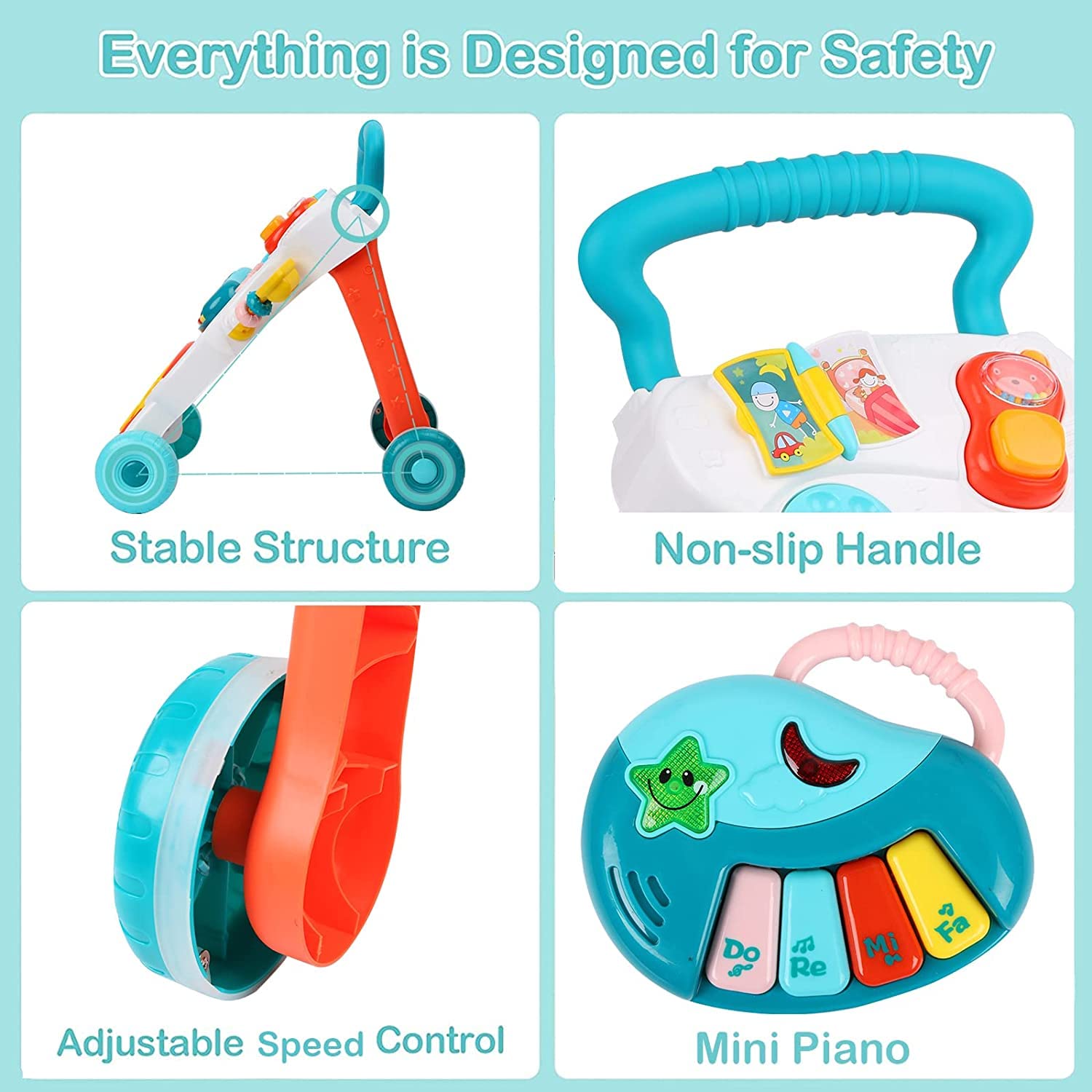 Σχεδιασμένη για να προσφέρει σταθερότητα και ασφάλεια, διαθέτει αντιολισθητικές ρόδες με ρυθμιζόμενη ταχύτητα, ανθεκτική λαβή και εργονομική κατασκευή που βοηθά στην ορθή ανάπτυξη της βάδισης.