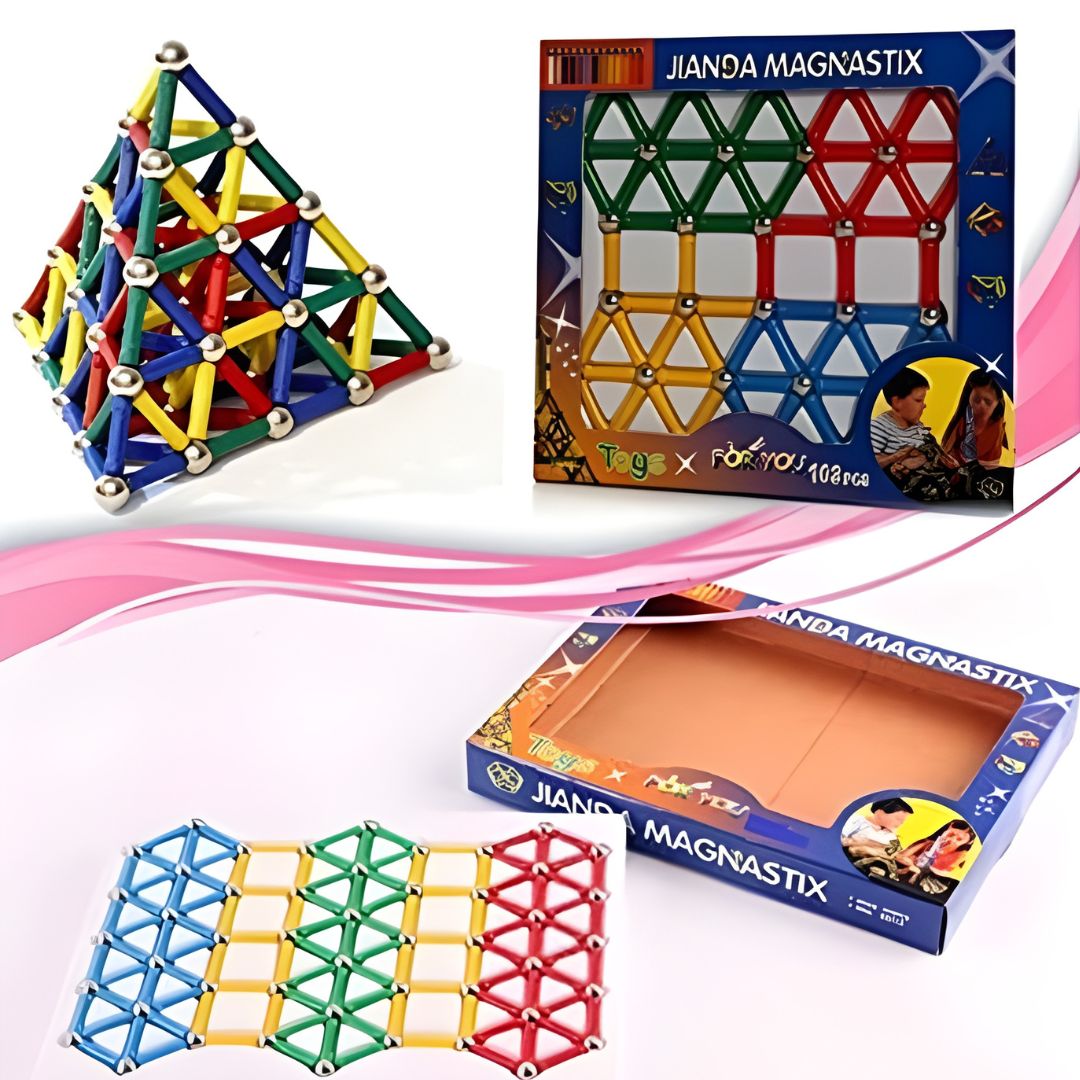 Με ζωντανά χρώματα (κόκκινο, μπλε, πράσινο, κίτρινο) και ανθεκτικά μαγνητικά κομμάτια, τα παιδιά μπορούν να δημιουργήσουν πύργους, γέφυρες, πυραμίδες ή δικά τους πρωτότυπα σχήματα.
