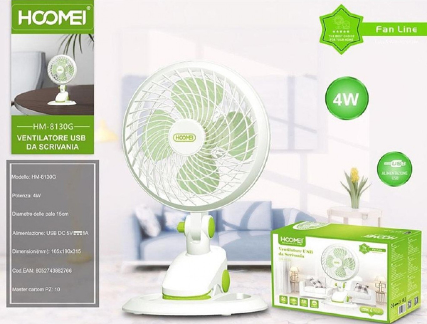 Hoomei Μίνι Φορητός Επιτραπέζιος Ανεμιστήρας USB 3W 15cm με 2 Ταχύτητες & Αποσπώμενη Βάση Στήριξης - Πράσινο