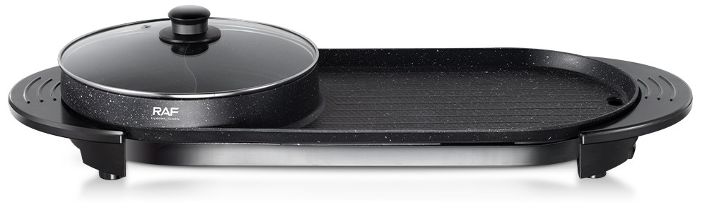 Η ηλεκτρική σχάρα και hot pot 2-σε-1 RAF έχει σχεδιαστεί για όσους θέλουν να ετοιμάζουν διαφορετικά είδη φαγητού ταυτόχρονα, χάρη στην ευρεία αντικολλητική επιφάνεια και το στρογγυλό δοχείο με διαχωριστικό.