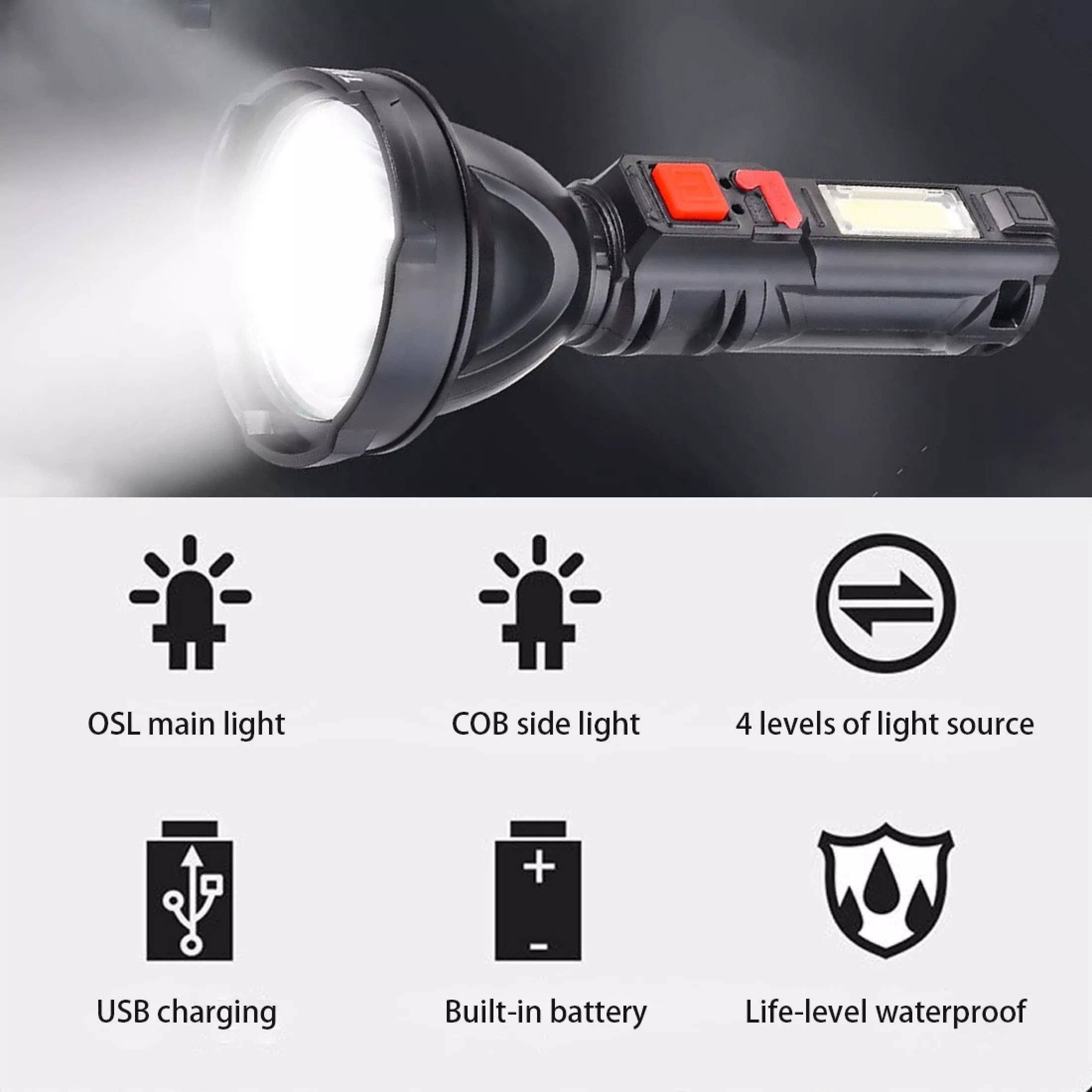 Διαθέτει 4 λειτουργίες φωτισμού: δυνατή, μεσαία, strobe και πλαϊνό φακό LED COB.
