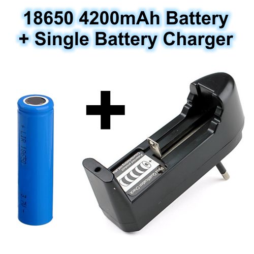 Σετ φορτιστή και επαναφορτιζόμενης μπαταρίας Li-Ion 18650 3,7V 4200 mAh κατάλληλο για όλους τους επαναφορτιζόμενους φακούς LED. Ειδική προνομιακή τιμή.