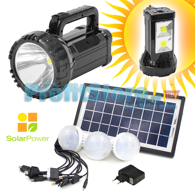 Πλήρες ηλιακό πακέτο φωτισμού με ηλιακό panel, μπαταρία με ισχυρότατο φακό και φωτιστικό LED 200LM, θύρα usb για φόρτιση συσκευών, 3 λάμπες led μεγάλης φωτεινότητας 100LM και πλεξούδα usb με αντάπτορες για φόρτιση διαφορετικών συσκευών και κινητών τηλεφώνων.