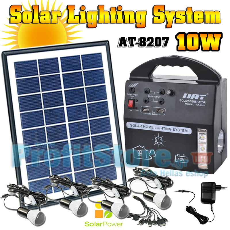 Πλήρες ηλιακό πακέτο φωτισμού με ισχυρό ηλιακό panel 10 Watt, βαλιτσάκι με ενσωματωμένη μπαταρία 7,0Ah που διαθέτει ισχυρό φακό και φωτιστικό LED, 2 θύρες usb 1Α για φόρτιση συσκευών, 4 λάμπες led 5 Watt - 120 Lumens και πλεξούδα usb με αντάπτορες για φόρτιση διαφορετικών συσκευών και κινητών τηλεφώνων.