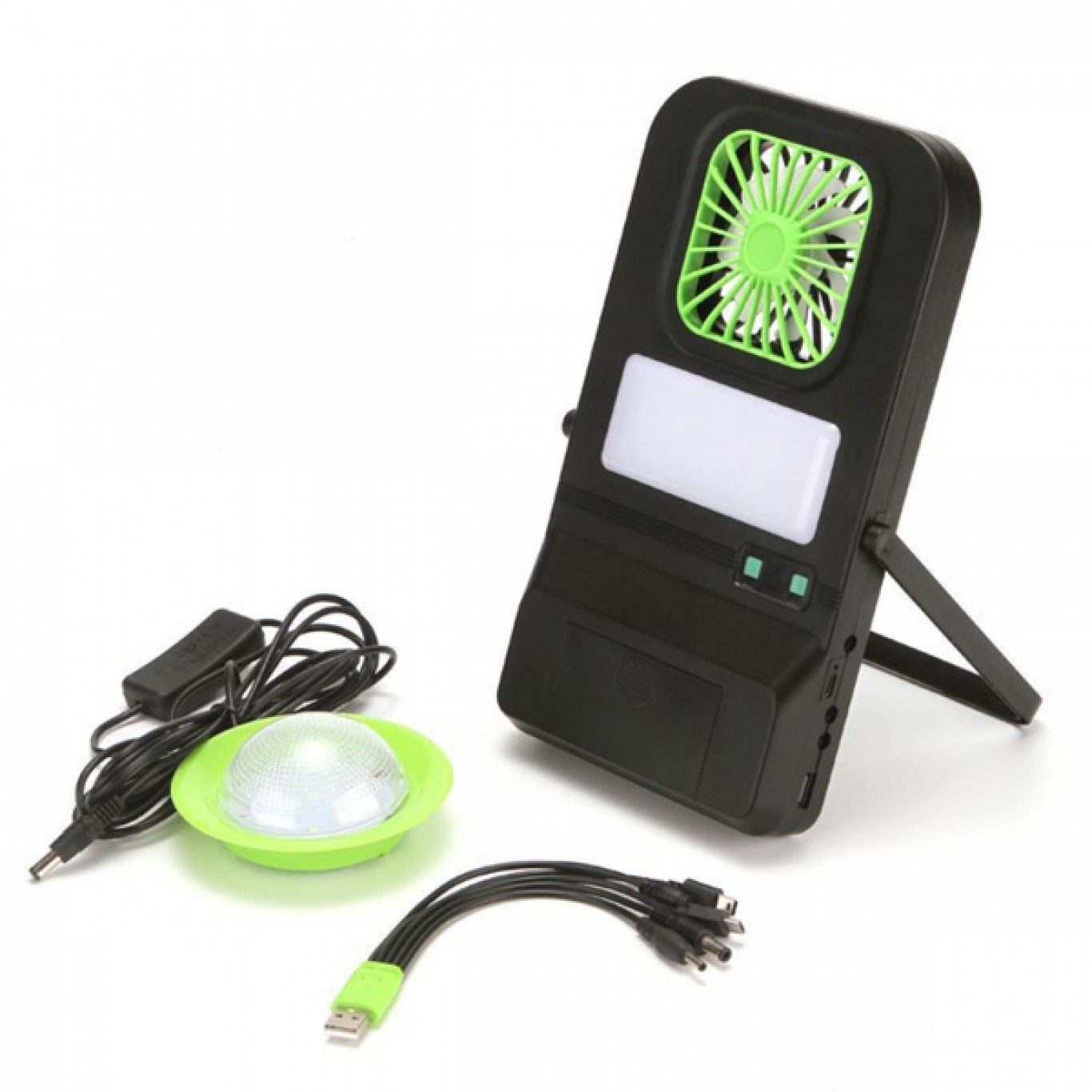 Πλήρες ηλιακό πακέτο φωτισμού και φόρτισης PowerBank μικρών διαστάσεων με ηλιακό panel, μπαταρία με φωτιστικό LED,ανεμιστήρα 3 ταχυτήτων και θύρα usb για φόρτιση πολλών διαφορετικών συσκευών και κινητών τηλεφώνων.