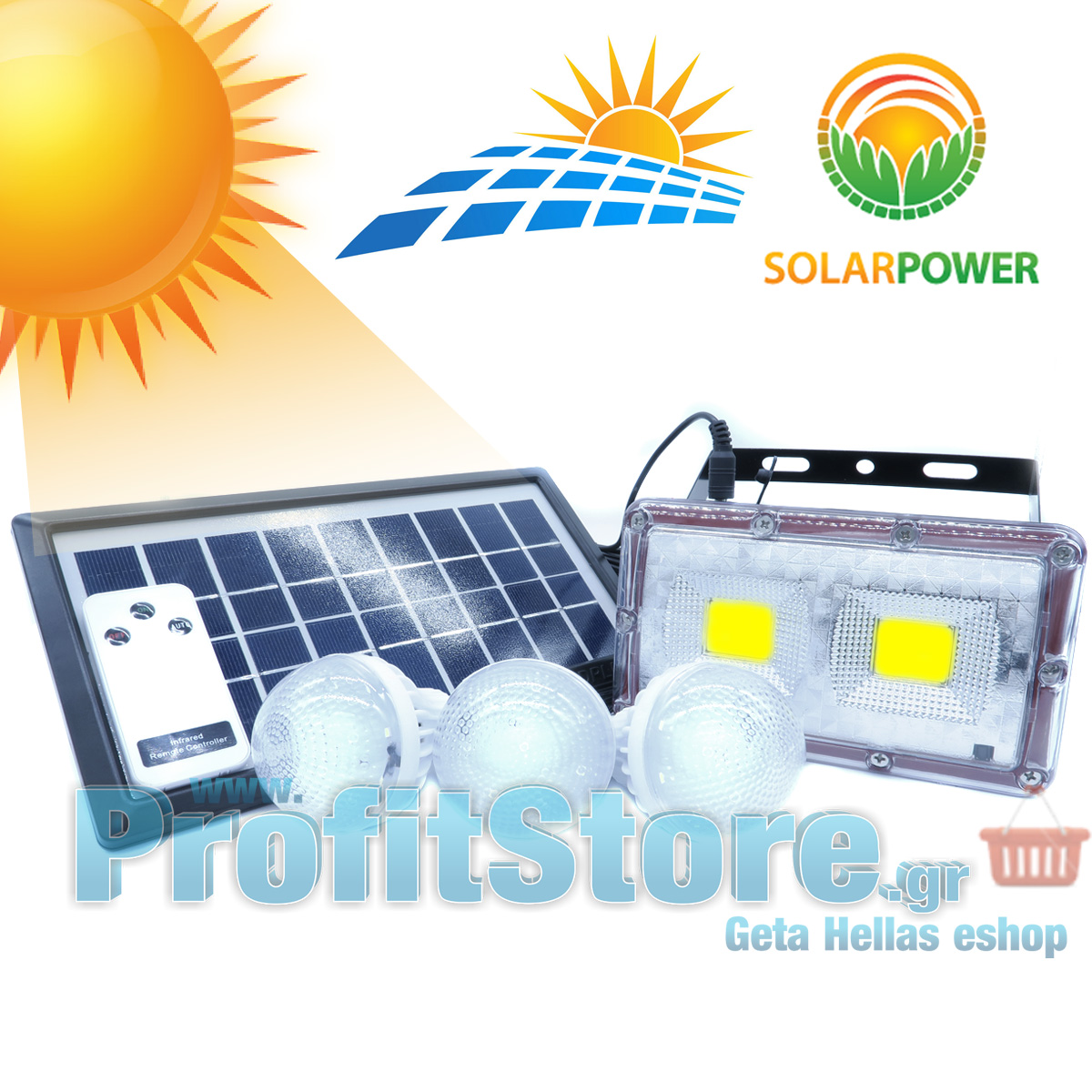 Εξαιρετικά μικρό και φορητό, πλήρες ηλιακό πακέτο φωτισμού με τηλεχειριστήριο, ηλιακό panel 3,5W, φωτιστικό / διπλό προβολέα LED διάχυτου φωτισμού 400LM, θύρα USB για φόρτιση συσκευών, 3 λάμπες led μεγάλης φωτεινότητας 150LM η κάθε μία και πλεξούδα USB με αντάπτορες για φόρτιση διαφορετικών συσκευών και κινητών τηλεφώνων.