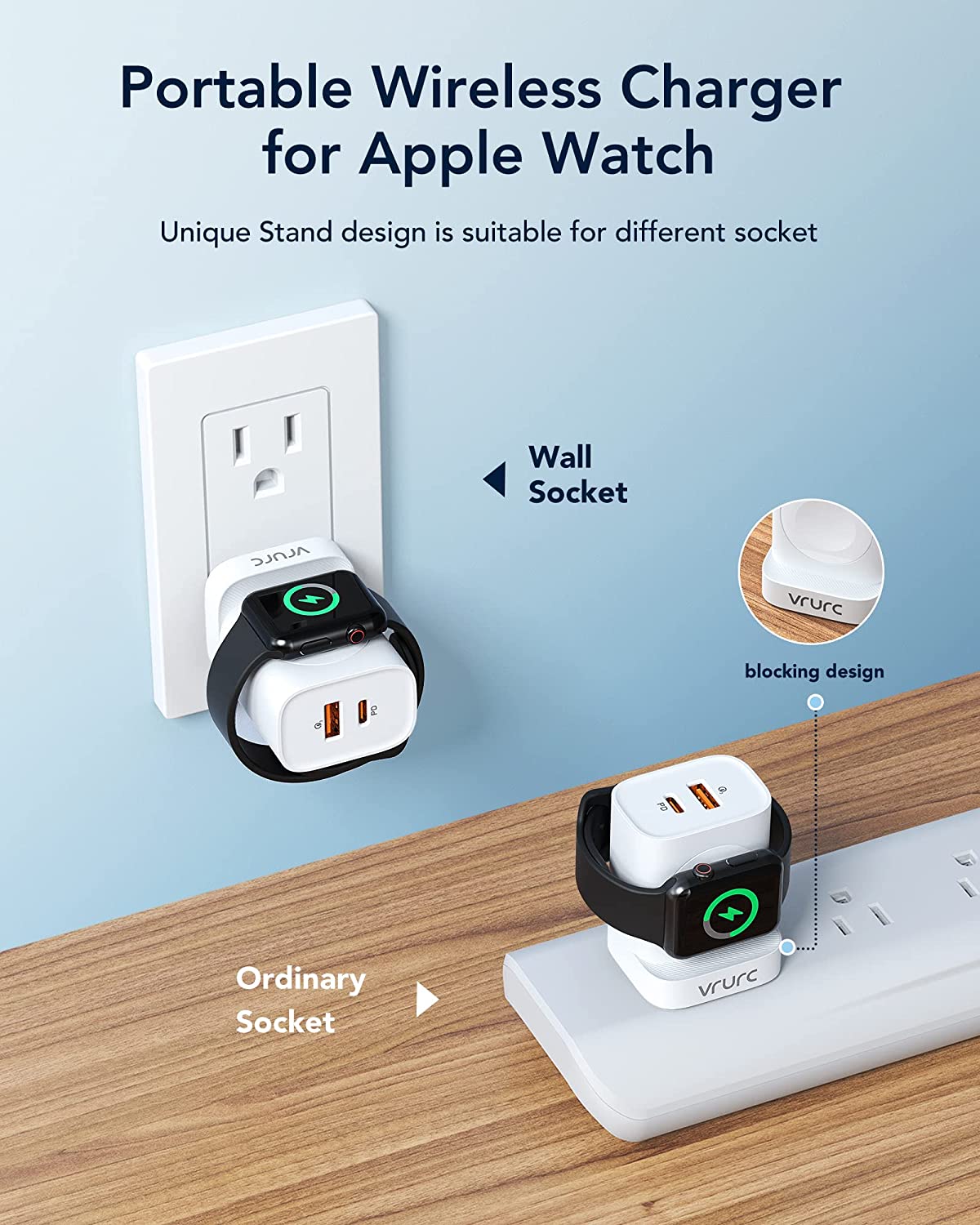 Εξοπλισμένο με ασύρματο φορτιστή USB-C, USB-A και Apple Watch, σας απαλλάσσει από ακατάστατους φορτιστές με διάφορες διεπαφές. Με τις αναδιπλούμενες καρφίτσες και το φορητό μέγεθος, δεν θα πιάσει πολύ χώρο στην τσάντα σας.