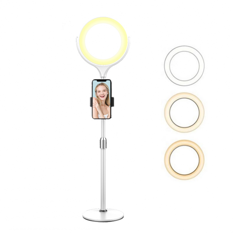 Κομψό, φορητό, επιτραπέζιο φωτογραφικό φωτιστικό LED Ring Light με πτυσσόμενο stand και βάση κινητού με σφιγκτήρα για να το τοποθετείτε σε όποιο ύψος του stand θελήσετε.