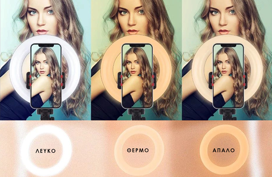 Το φωτιστικό δαχτυλίδι διαθέτει 3 ρυθμίσεις θερμοκρασίας φωτός: Λευκό για ουδέτερο φωτισμό, Θερμό και Απαλό για τέλειες αποχρώσεις δέρματος και όμορφα μάτια. Ακόμη διαθέτει 11 σκάλες φωτεινότητας ώστε να παρέχει τον ιδανικό φωτισμό για κάθε συνθήκη.
