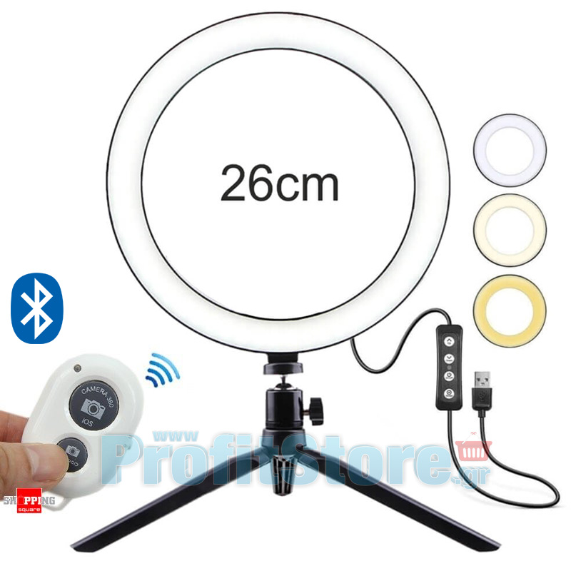 Νέο φωτογραφικό δαχτυλίδι Ring Led Light Lamp 200 lux με Bluetooth ασύρματο χειριστήριο, διάμετρο 26cm, τρίποδο και Βάση Στήριξης Κινητού και απογειώσετε τις φωτογραφίες σας.