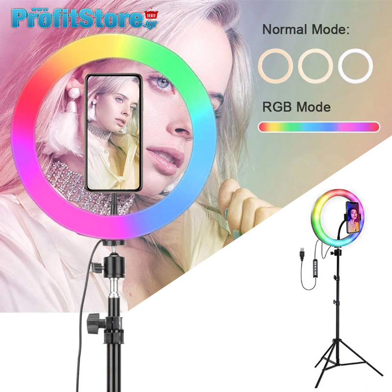 RGB Φωτογραφικό Φωτιστικό Δαχτυλίδι LED 30cm Πολύχρωμο USB με Εφέ Πολύχρωμου Φωτισμού, Τρίποδο & Βάση Στήριξης Κινητού - Ring Light Lamp