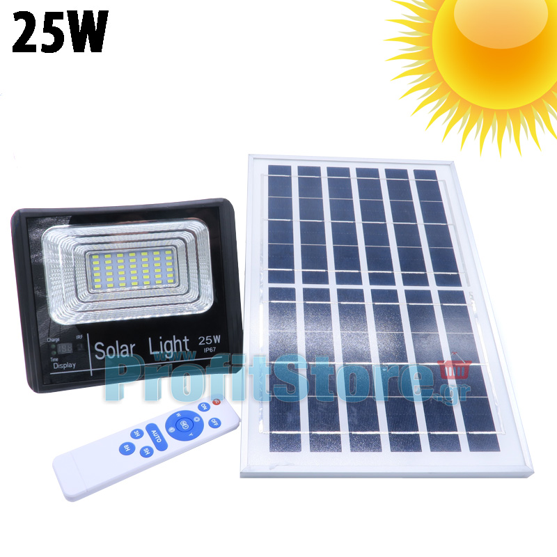 Αδιάβροχος Ηλιακός Προβολέας 25W με Φωτοβολταϊκό Πάνελ, Τηλεκοντρόλ, Χρονοδιακόπτη & LED Οθόνη Μπαταρίας - Solar Panel