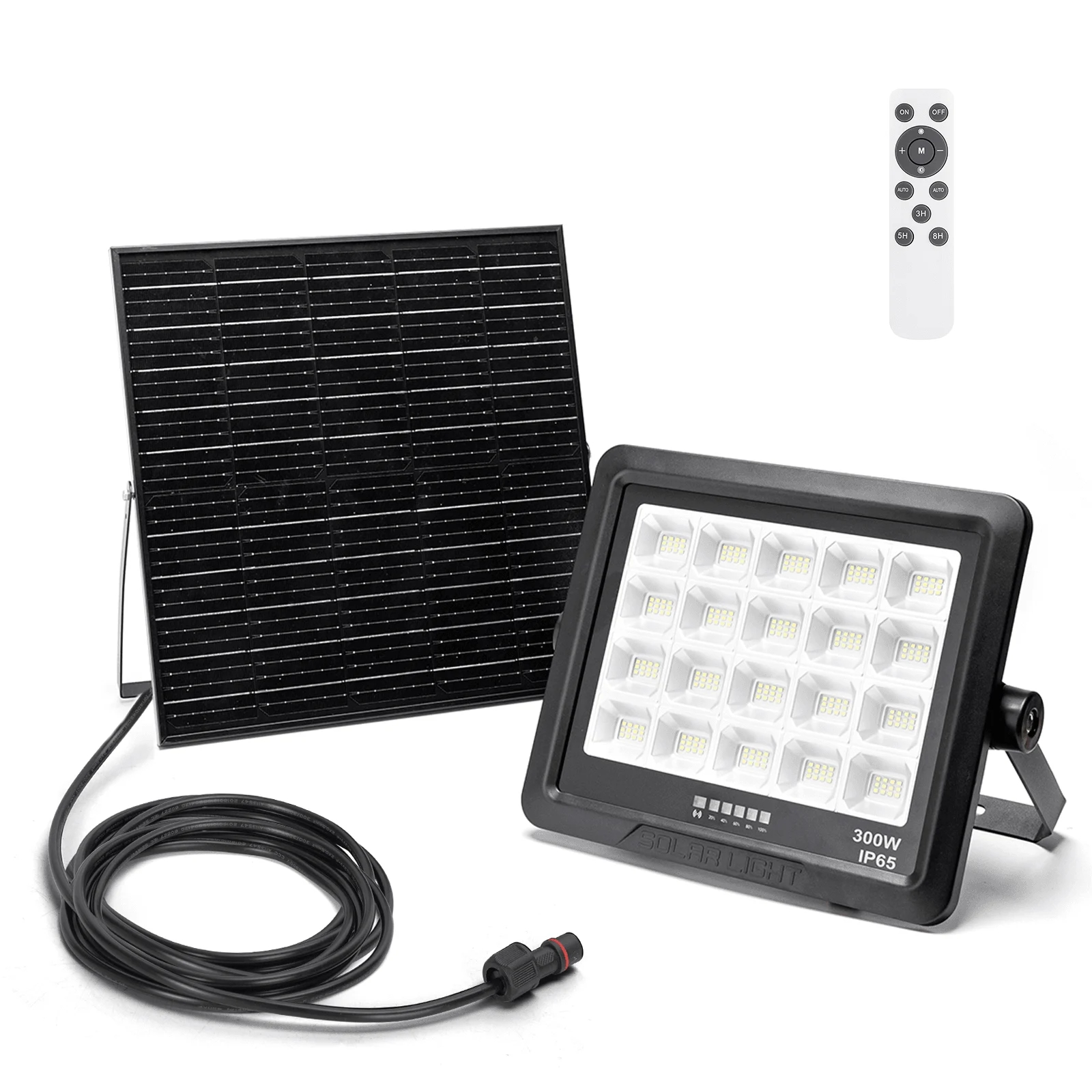 Ισχυρός ηλιακός προβολέας LED 300W με πάνελ 20W, αυτονομία 12h, φωτεινότητα 3000lm και τηλεχειριστήριο. Αδιάβροχος (IP65), με φως ημέρας 6500K – ιδανικός για κάθε εξωτερικό χώρο.