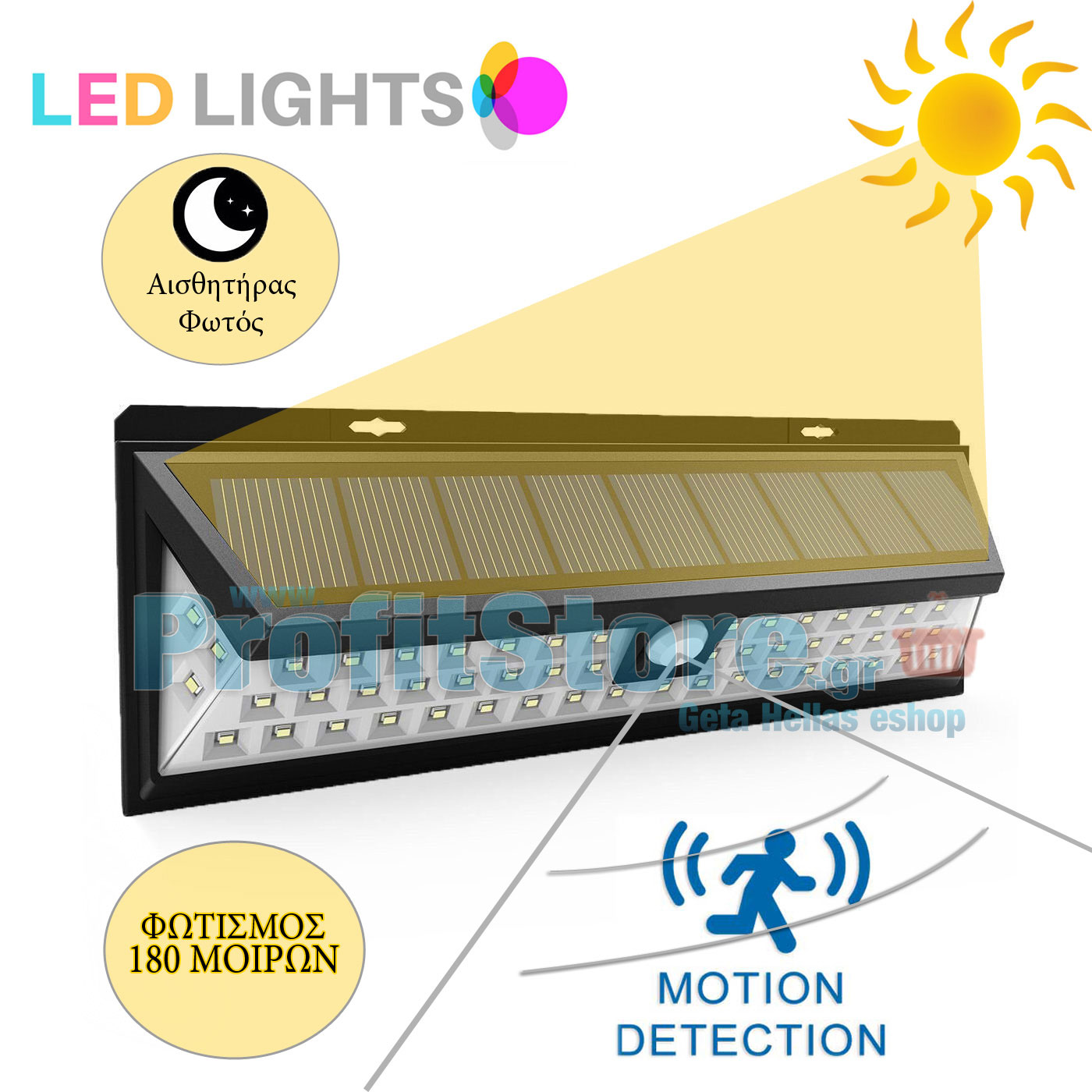 Ο αισθητήρας κίνησης που διαθέτει, μπορεί να εντοπίσει κίνηση σε απόσταση περίπου 8-10m και σε γωνία μέχρι και 180 μοίρες από το σημείο στήριξής του, σε σχέση με αντίστοιχα φωτιστικά στα οποία δεν ξεπερνάει τα 5 μέτρα και τις 120 μοίρες!