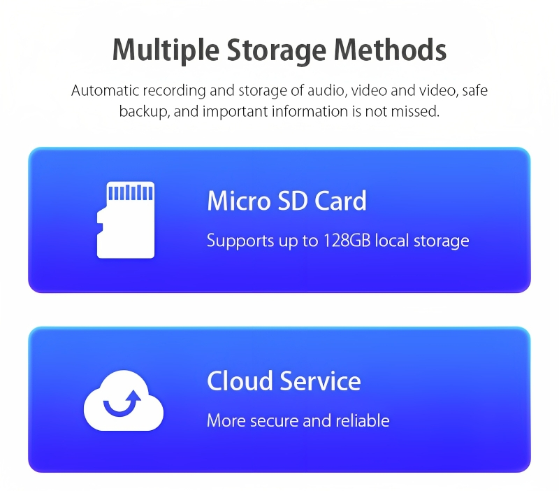 Επιπλέον, αυτή η κάμερα προσφέρει δυνατότητες καταγραφής βίντεο. Μπορείτε να τοποθετήσετε μια κάρτα MicroSD έως 128Gb (δεν περιλαμβάνεται) για να αποθηκεύσετε το καταγεγραμμένο υλικό τοπικά ή να το αποθηκεύσετε σε Cloud.