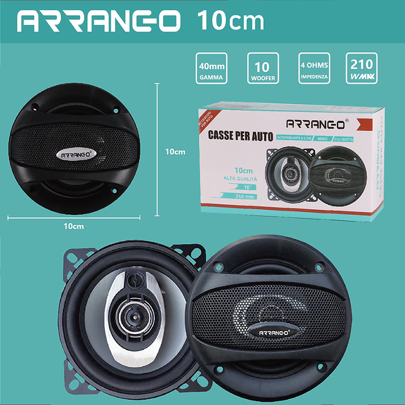 Ζεύγος ομοαξονικών ηχείων της Arranco, 2 δρόμων 10 εκατοστών ισχύος 210 Watt Max. Εξοπλισμένα με κωνικό Woofer 102mm για πλούσια μπάσα και κωνικό Tweeter για καθαρές υψηλές νότες.
