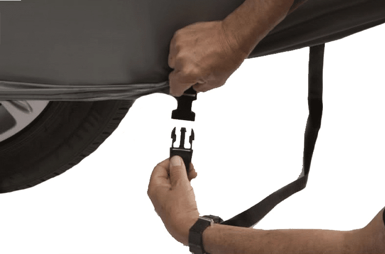 Η εφαρμογή είναι εύκολη και σταθερή, χάρη στους ιμάντες με κλιπ που συγκρατούν την κουκούλα στη θέση της, ακόμη και σε συνθήκες αέρα.
