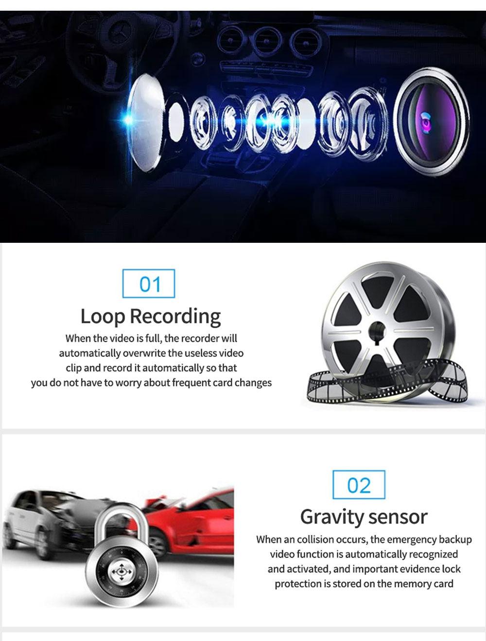 Ο αισθητήρας G-sensor βαρύτητας θα κάνει την διαφορά, μιας και με το που ανιχνευτεί κάποια απότομη επιτάχυνση ή επιβράδυνση θα μπει η κάμερα σε λειτουργία κλειδώματος του καταγραφόμενου συμβάντος. Πιο απλά, θα μαρκάρει το συγκεκριμένο αρχείο και θα το ασφαλίσει έτσι ώστε να μην αφήσει να γίνει over write από κάποιο άλλο βίντεο.