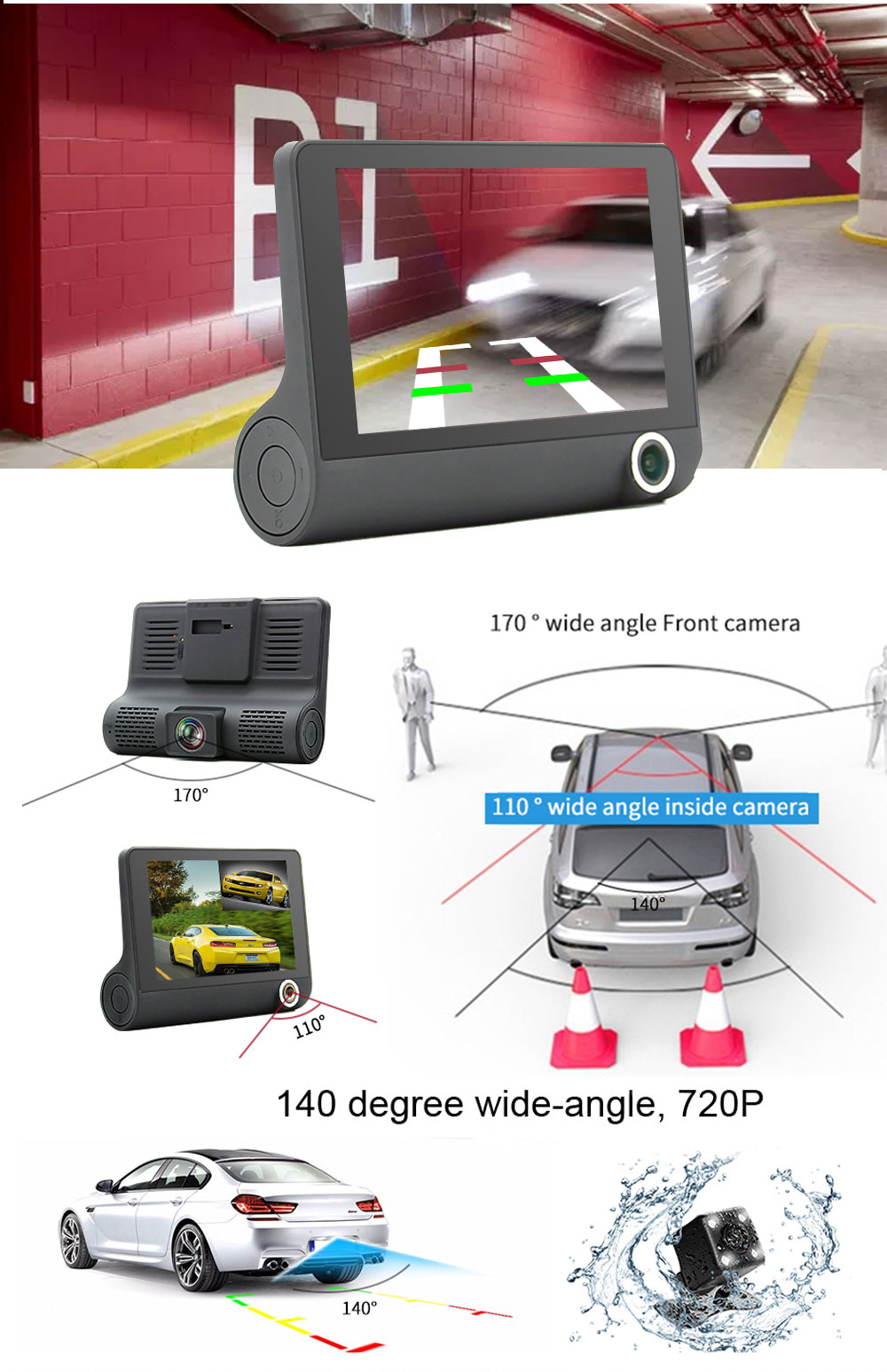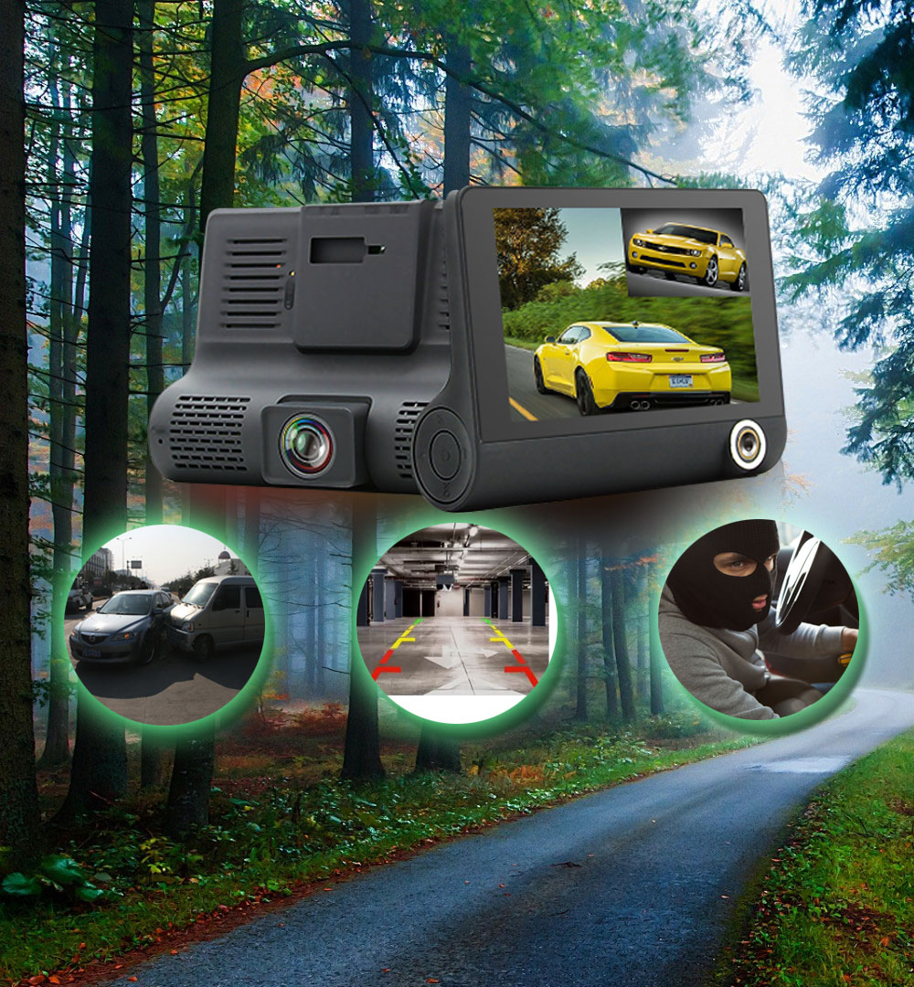 Τριπλή κάμερα καταγραφικό για λήψη βίντεο Full HD 1080p 30fps και φωτογραφιών 15MP HDR (High Dynamic Range Imaging) με μεγάλη οθόνη 4", φωτεινό, ευρυγώνιο, υψηλής ευαισθησίας φακό 170 μοιρών, G sensor και ανίχνευση κίνησης, ιδανική για καταγραφή πορείας, δολιοφθορών αυτοκινήτου στο εσωτερικό και το εξωτερικό.