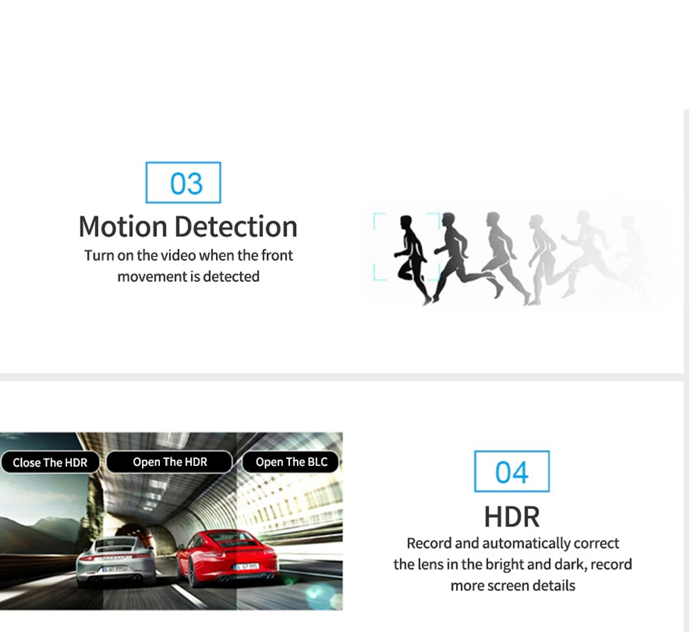 Ο ανιχνευτής κίνησης επιτρέπει στην κάμερα να ξεκινήσει να καταγράφει αμέσως, μόλις αντιληφθεί κάποια κίνηση στον ορίζοντά της, με αποτέλεσμα να μπορείτε να έχετε 24-ωρο υλικό οποιασδήποτε κίνησης γύρω από το αυτοκίνητό σας ή την περιουσία σας. Ελέγξτε αν κάποιος σας γρατζούνισε ή σας τράκαρε όσο είχατε το αυτοκίνητό σας παρκαρισμένο. Εξαιρετική λύση για να αποφύγετε ή να αποδείξετε δολιοφθορές και κλοπές!