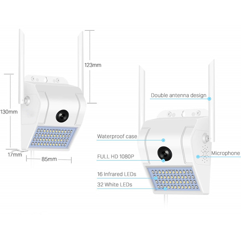 2 σε 1 Αδιάβροχο, επιτοίχιο φωτιστικό LED εξωτερικού χώρου που ενσωματώνει μια καμουφλαρισμένη IP WiFi camera ασφαλείας. Διαθέτει αισθητήρα κίνησης, για αυτόματη καταγραφή και ενεργοποίηση του φωτιστικού μόλις αντιληφθεί κίνηση.