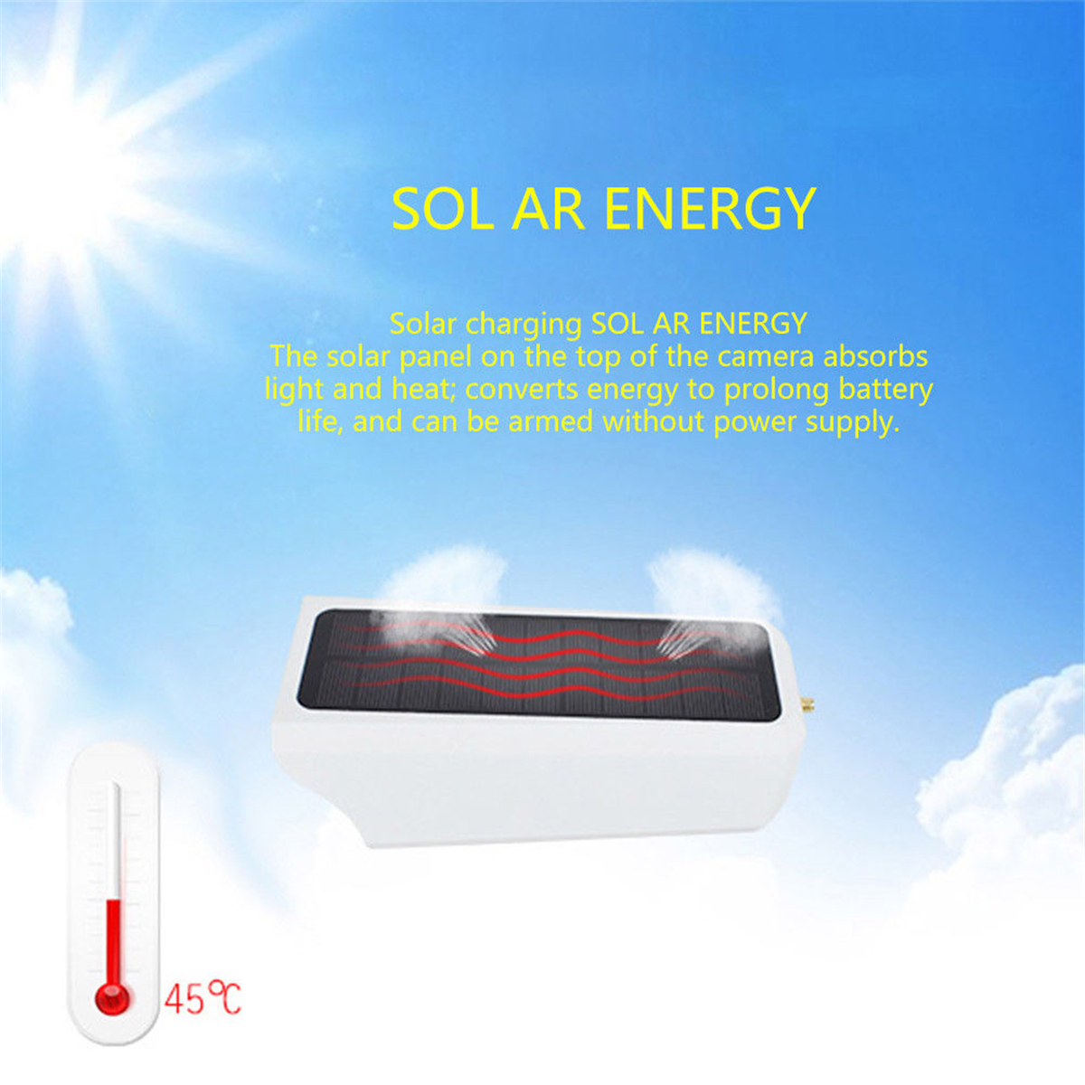 Το φωτοβολταϊκό πάνελ είναι υψηλής ευαισθησίας και μπορεί να φορτίσει την μπαταρία (πιο αργά) ακόμα και σε μέρες συννεφιάς. Σε θερμοκρασία πάνω από 33 Βαθμούς η κάμερα απορροφάει την θερμότητα και την μετατρέπει σε ενέργεια τροφοδοσίας της κάμερας για να μην καταναλώνει την μπαταρία!