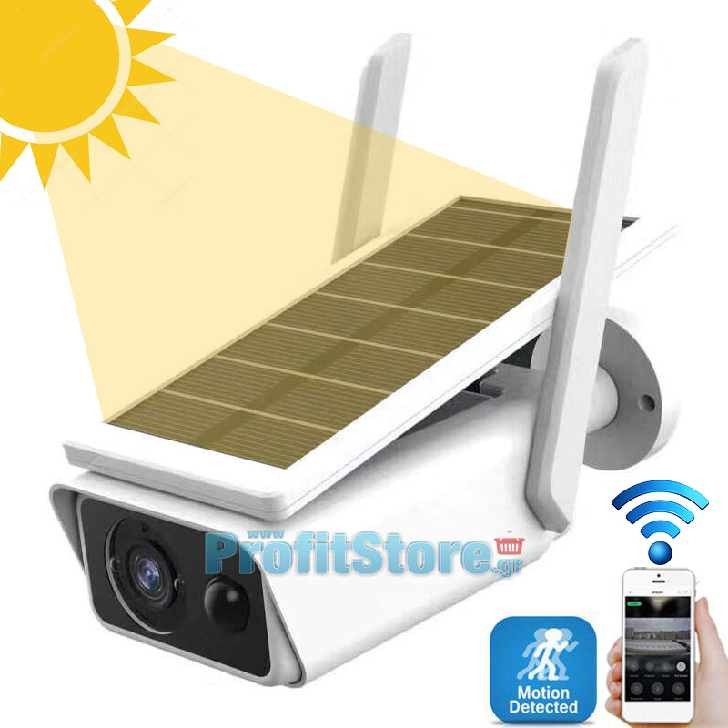 Η ηλιακή κάμερα IP - WIFI είναι αυτόνομη λειτουργεί χωρίς ρεύμα με ηλιακό πάνελ και συνδέεται ασύρματα στο ίντερνετ μέσω WIFI.