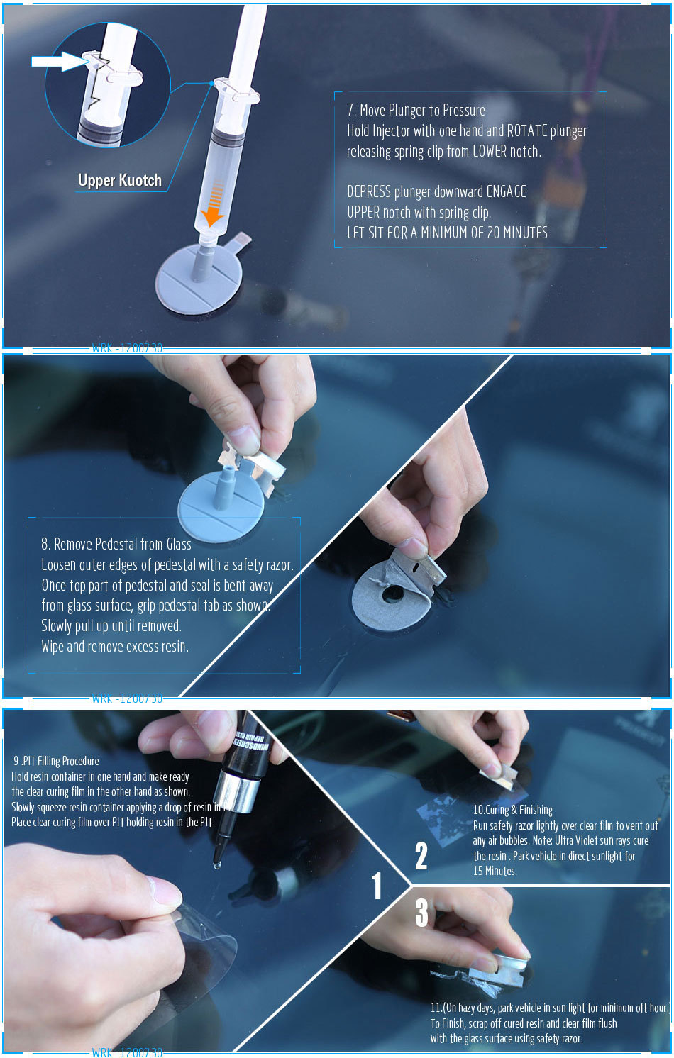 Ιδιότητες: Εύκολο στην χρήση του. Η σκλήρυνση γίνεται με το φως της ημέρας. Δεν χρειάζεται μίξη. Περιέχει όλα τα απαραίτητα για την επισκευή. Ταχεία σκλήρυνση Επισκευάζει θολώματα και ραγίσματα