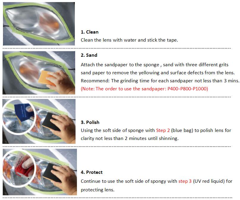 Τοποθετήστε προστατευτική ταινία γύρω από το φανάρι. Τρίψτε το φανάρι χωρίς πολύ πίεση με τα υαλόχαρτα νερού 400-800-1000 με την σειρά που αναγράφονται. Για καλύτερα αποτελέσματα χρησιμοποιήστε οικιακό τρυπάνι με τον αντάπτορα που παρέχεται