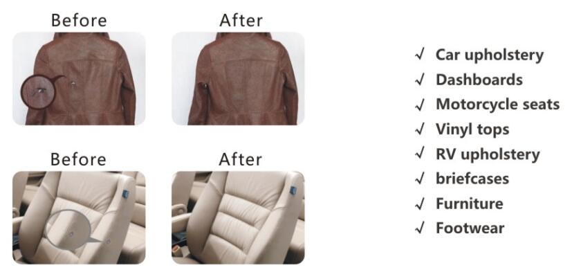 Επισκευάζει τρύπες και φθορές σε δερμάτινα, δερματίνη ή υφάσματα και μπορεί να εξαφανίσει σχεδόν και όλες τις γρατσουνιές. Είναι ότι πρέπει για δερμάτινα καθίσματα αυτοκινήτου αλλά και σπιτιού αφού πολύ γρήγορα θα έχουν εξαφανιστεί οι ενοχλητικές τρύπες που κατά λάθος δημιουργήσατε.